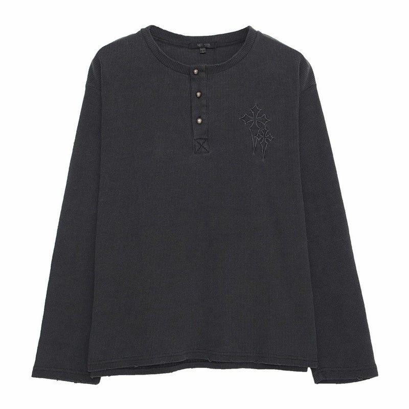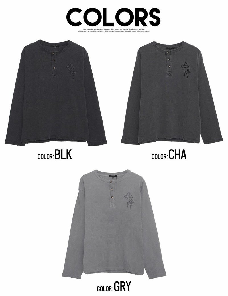 シンプルながら個性を引き立てる、十字架モチーフ刺繍入り長袖トップス。