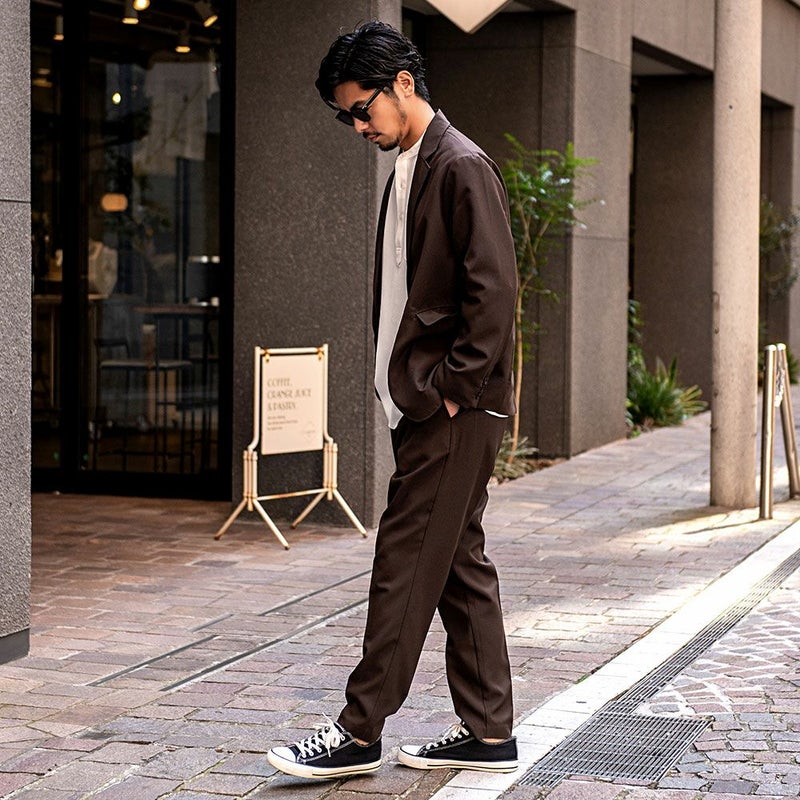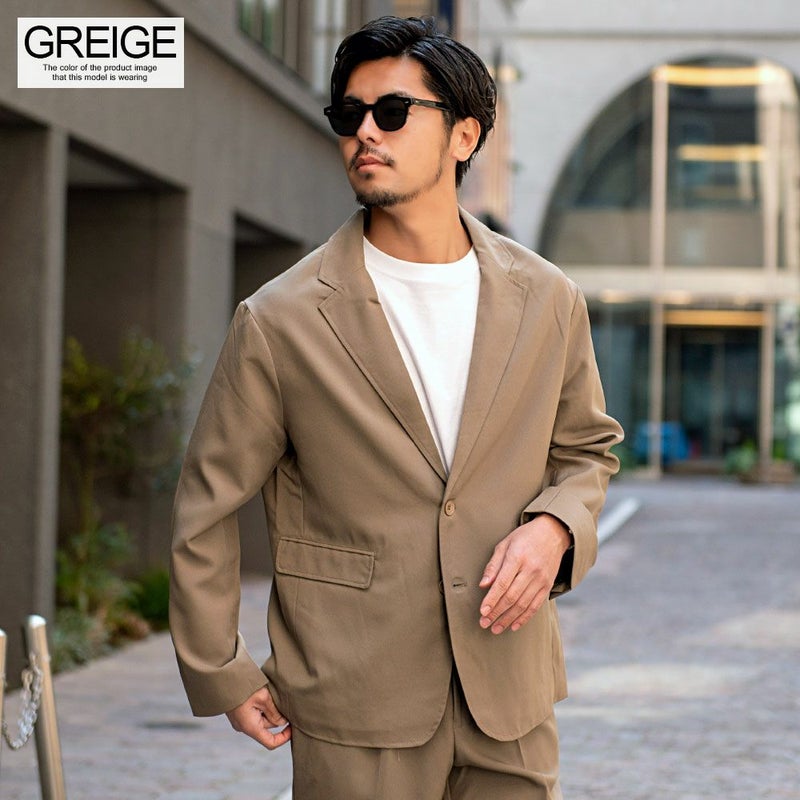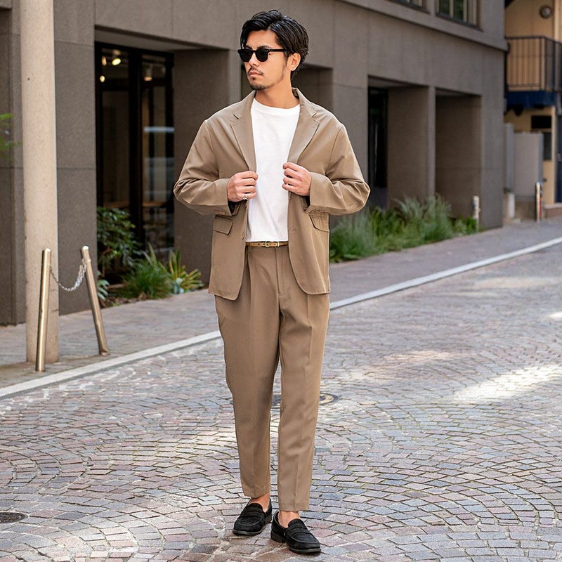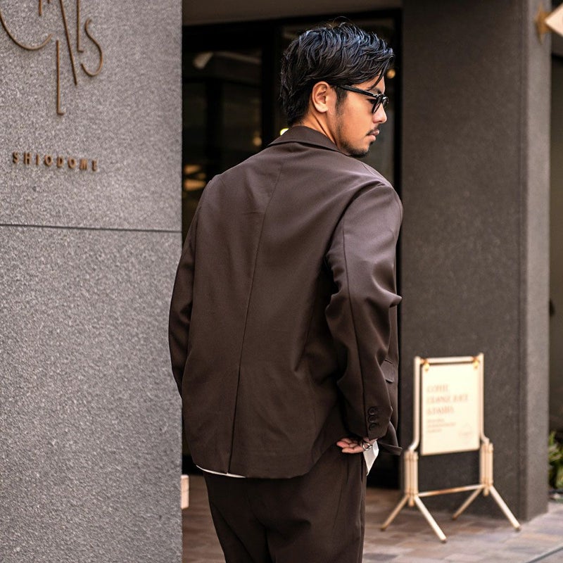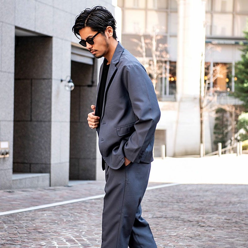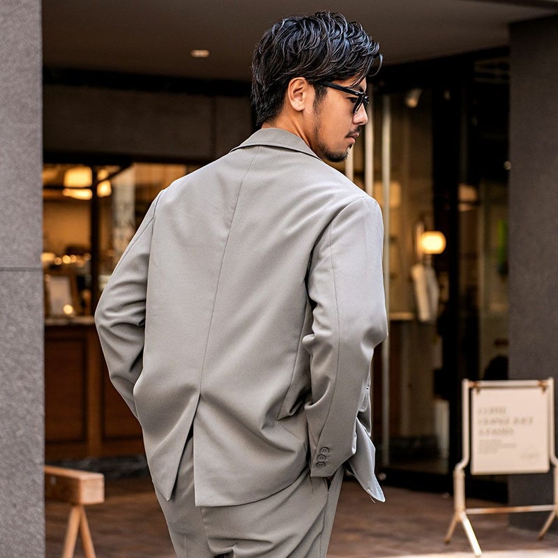 光沢感のある高級生地を使用し、上品なルックスと快適な着心地を両立させたテーラードジャケット&スラックスのセットアップ。