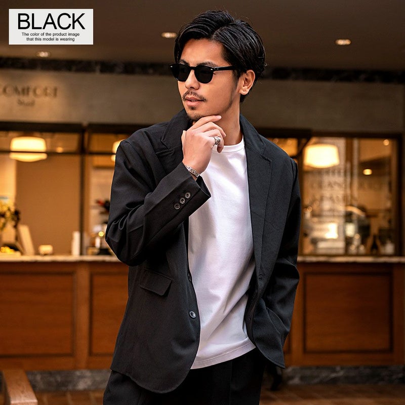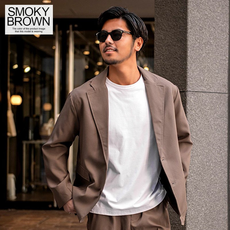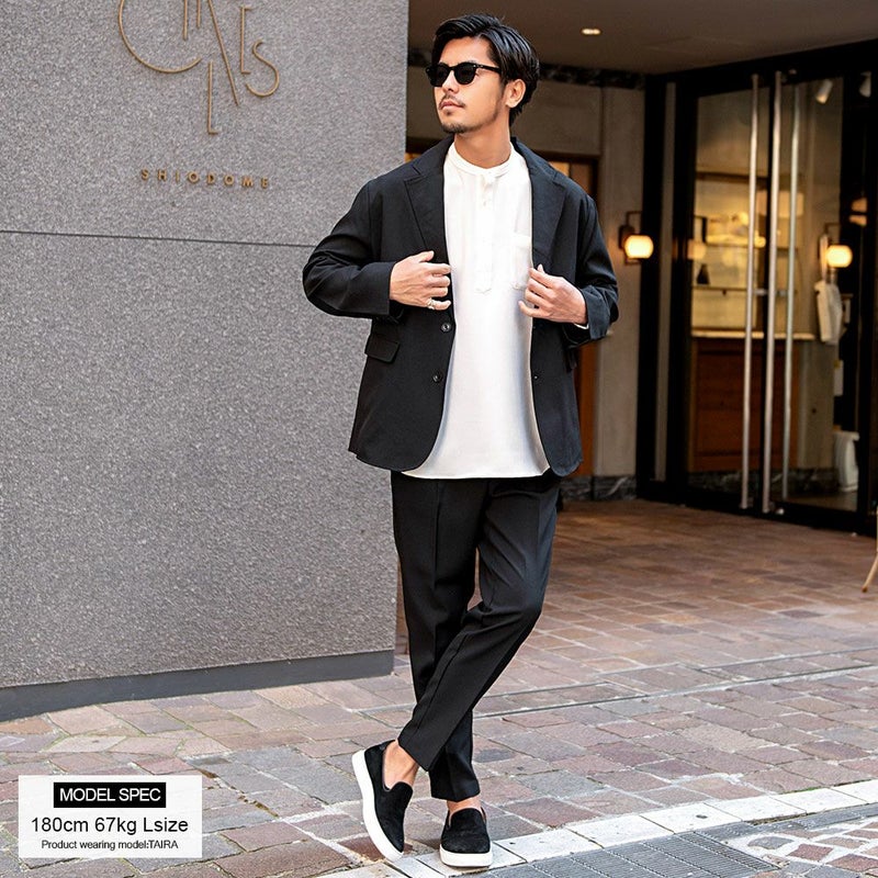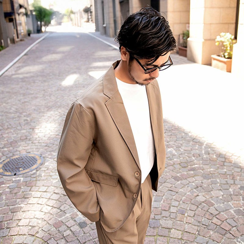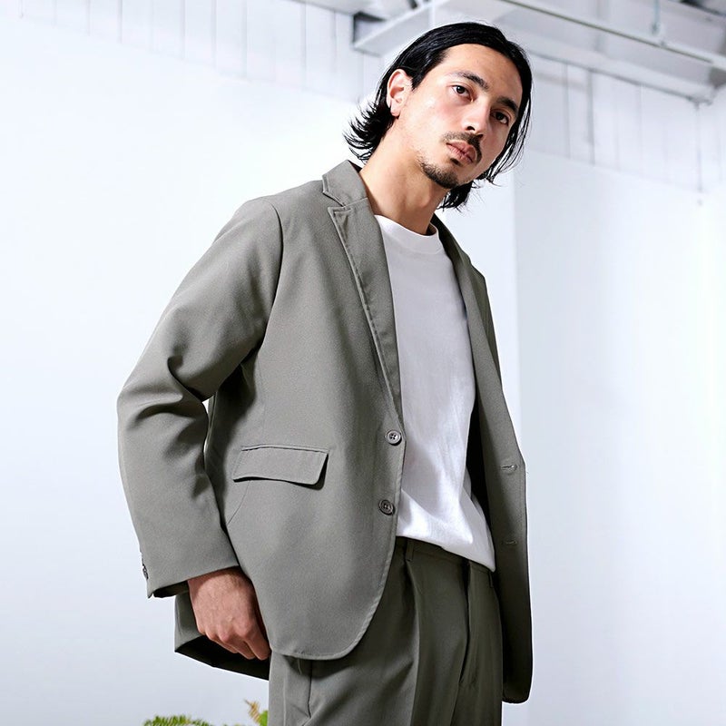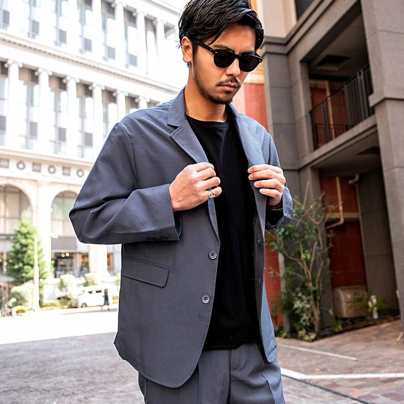 光沢感のある高級生地を使用し、上品なルックスと快適な着心地を両立させたテーラードジャケット&スラックスのセットアップ。