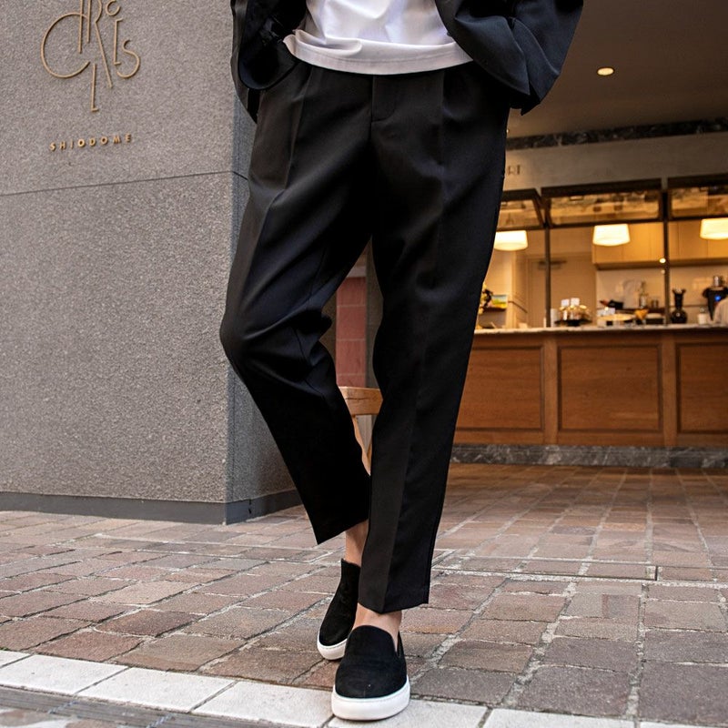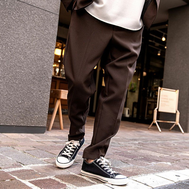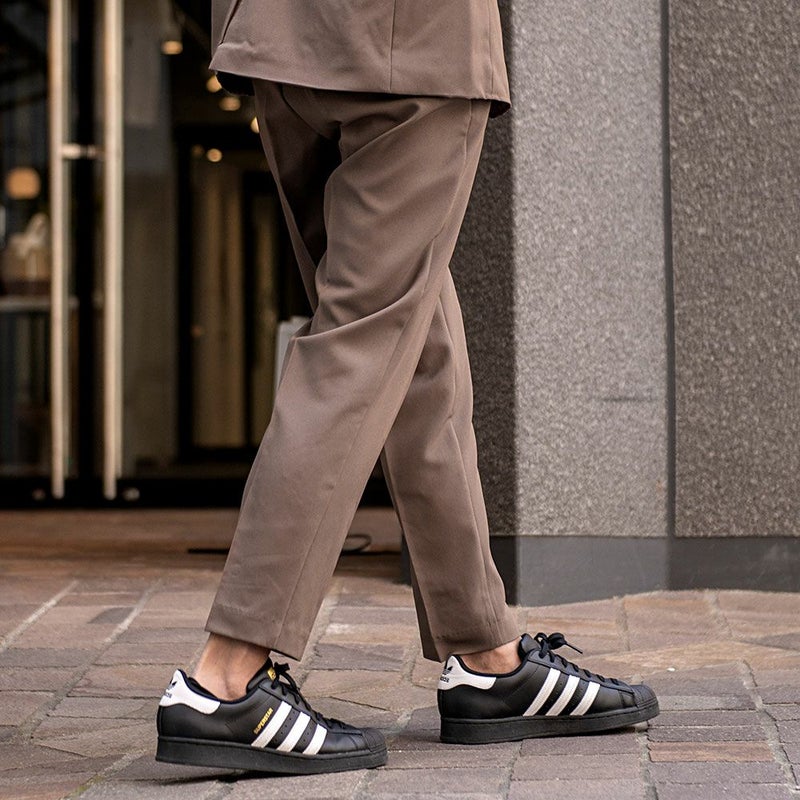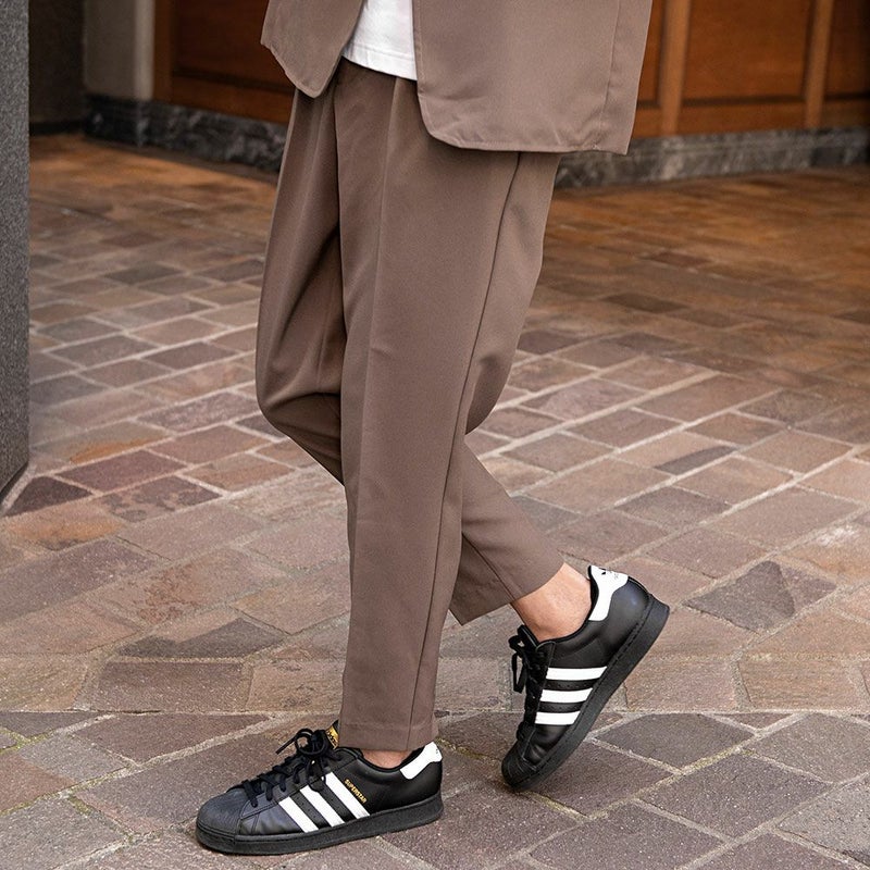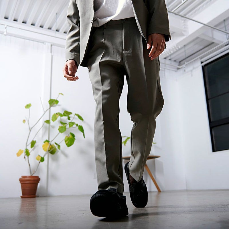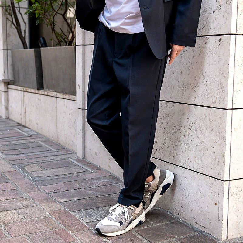 スラックス単体なら、Tシャツやニットと組み合わせて上品なリラックススタイルに。