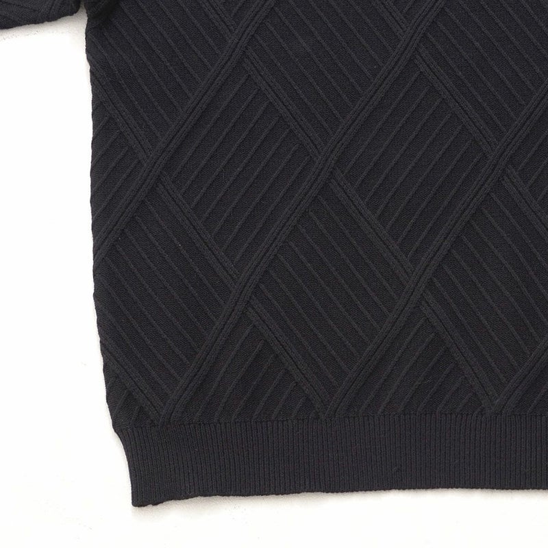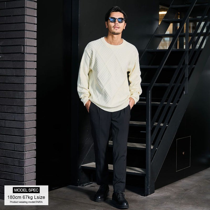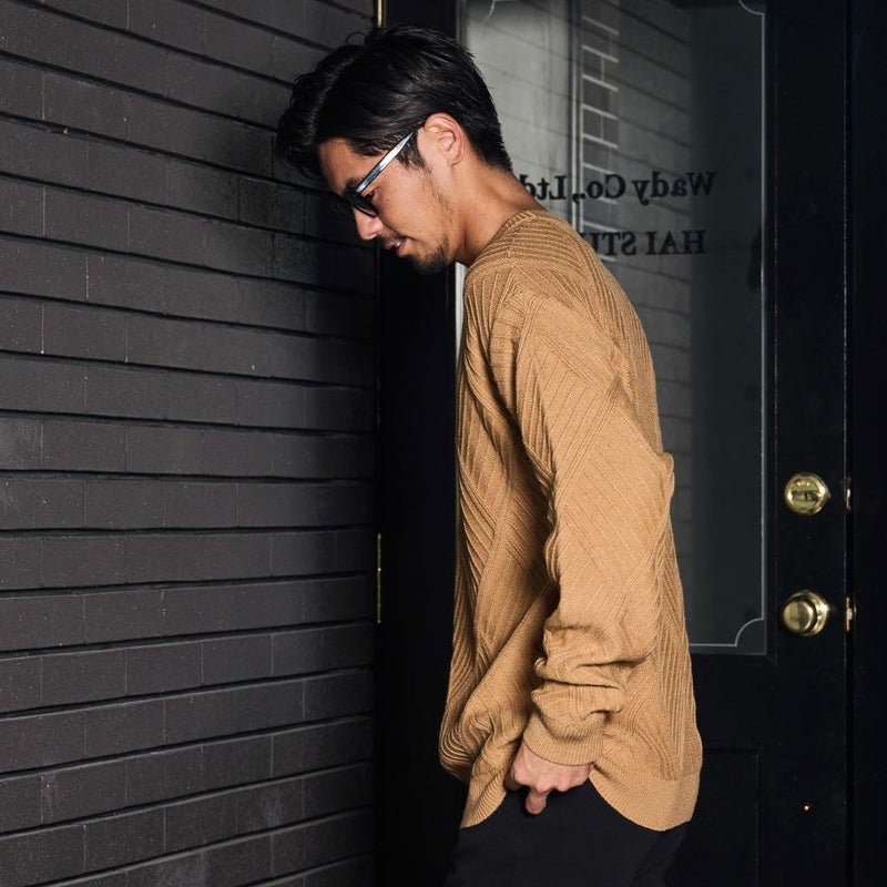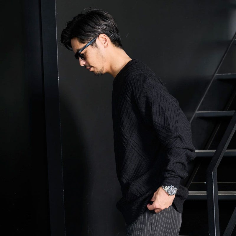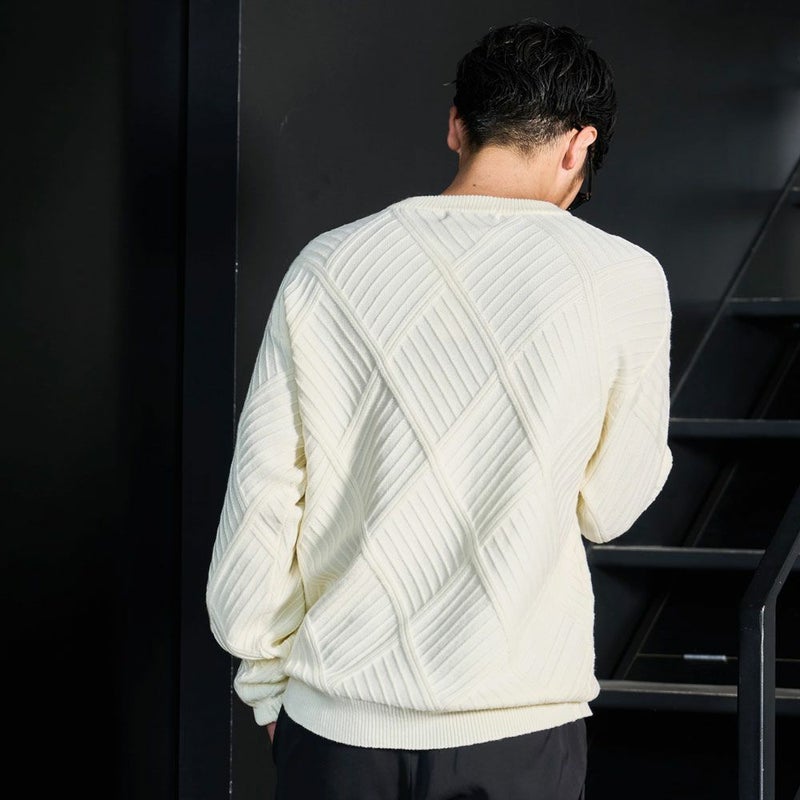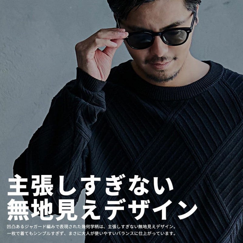 凹凸あるジャガード編みで表現された幾何学柄は、主張しすぎない“無地見え”のデザイン。