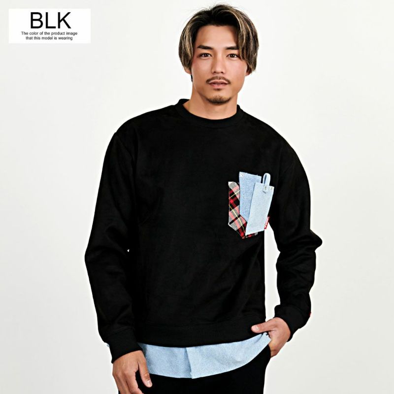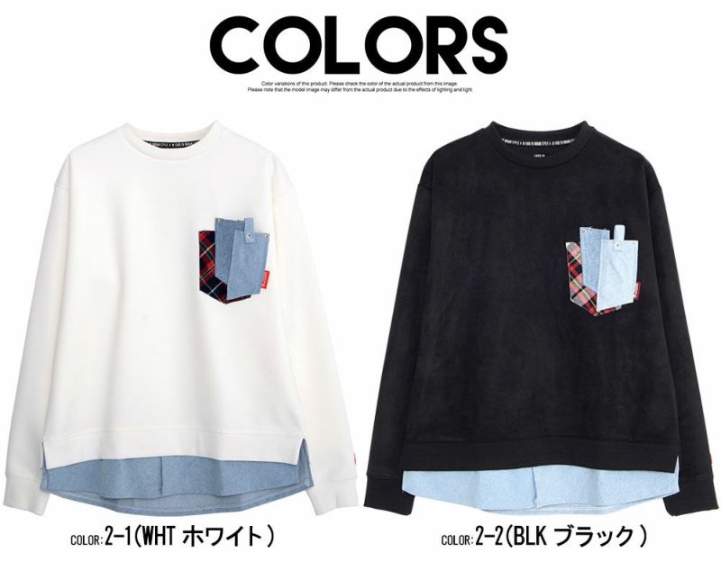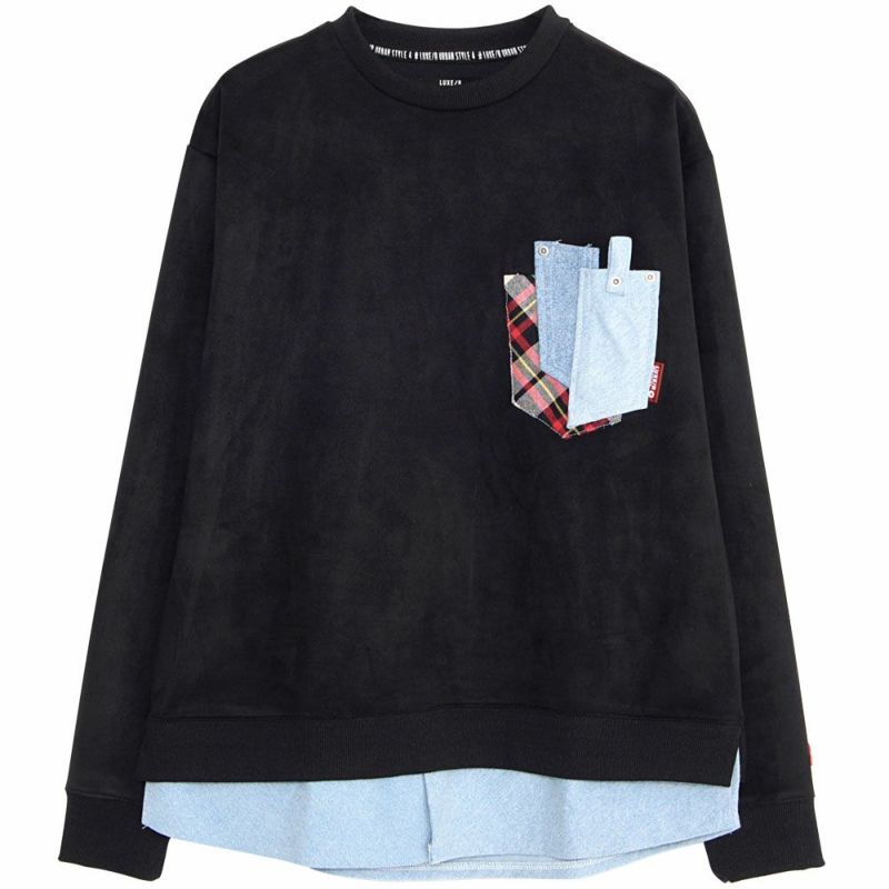 デニムとチェック柄の生地がポケットに施されたクルーネックトレーナー。裾はシャツを重ね着しているようなフェイクレイヤード仕様。 LUXE/R(ラグジュ)クルーネック デニムポケット長袖トレーナー/全2色