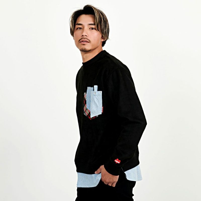 デニムとチェック柄の生地がポケットに施されたクルーネックトレーナー。