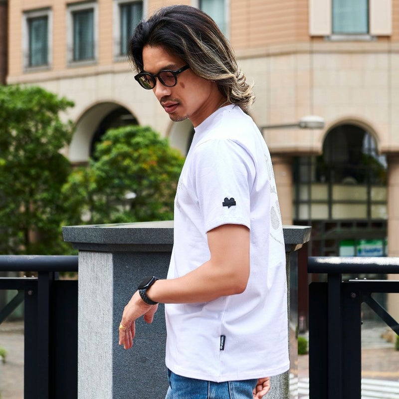 フロントにワンポイントとバック全体にラインストーンのスカルベアを施したインパクト抜群のカットソーTシャツ。