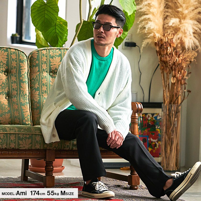 ざっくりとしたローゲージで編み込み立体感と程良いボリュームが特徴の片畦カーディガン。