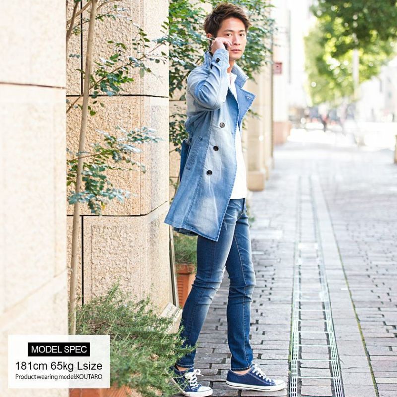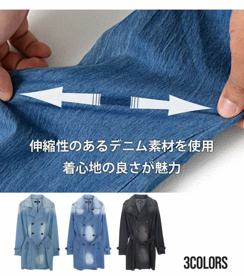 伸縮性のある素材を使用し着心地の良さが魅力のデニムトレンチコート。
