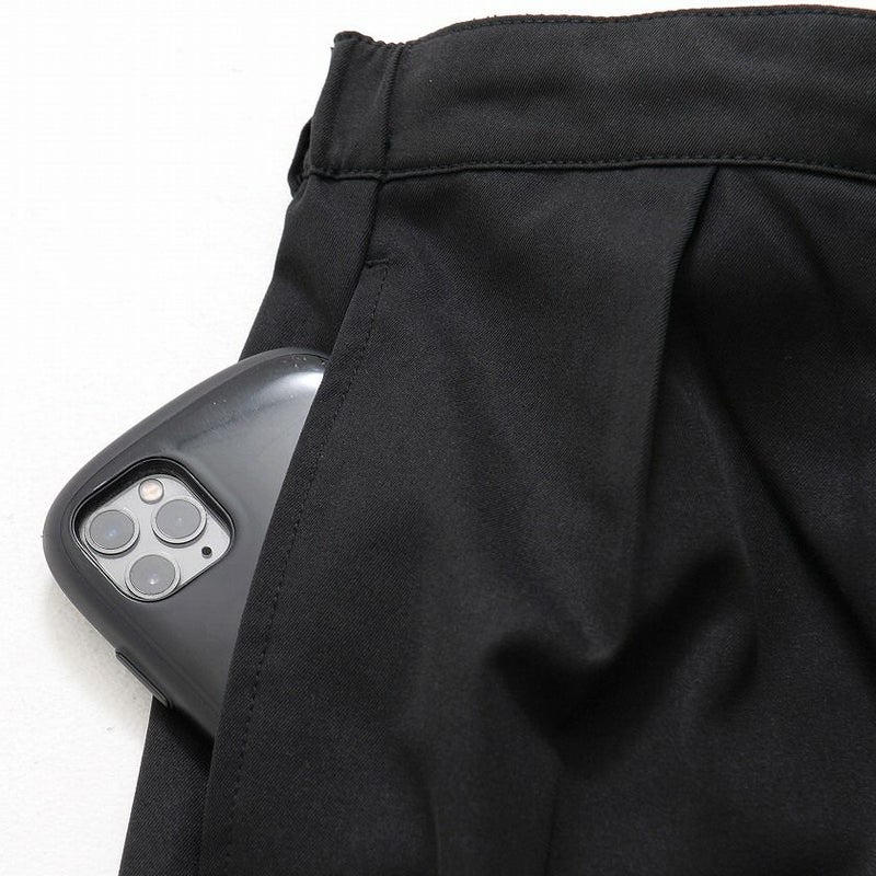タックが入っているので気になる腰回りをカバーしつつも裾にかけてすっきりとしたシルエットに。