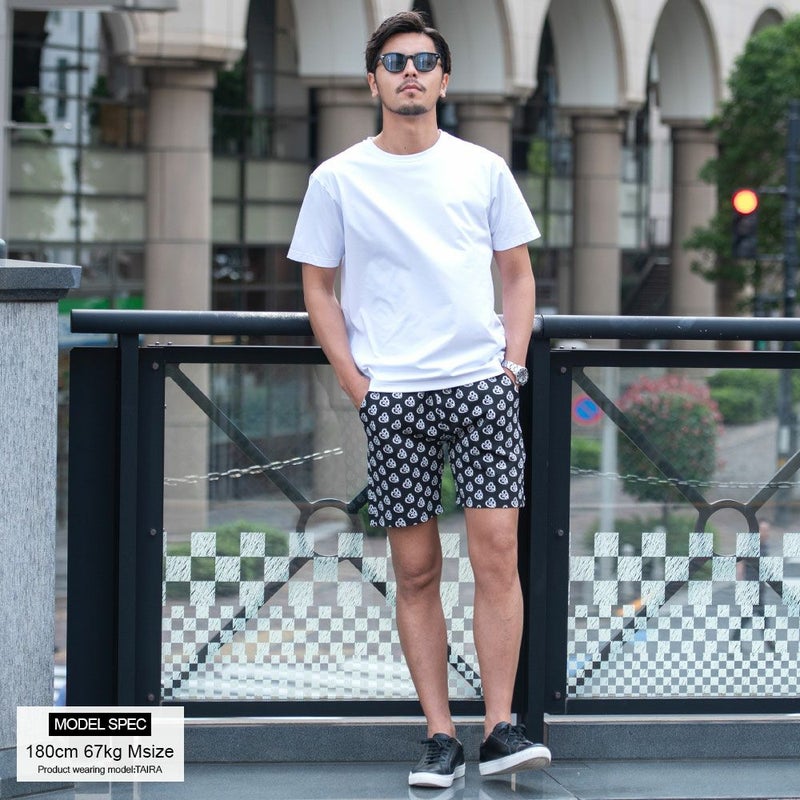 すっきりとした膝上丈と派手すぎず落ち着いた総柄が上品な雰囲気のハーフパンツ。
