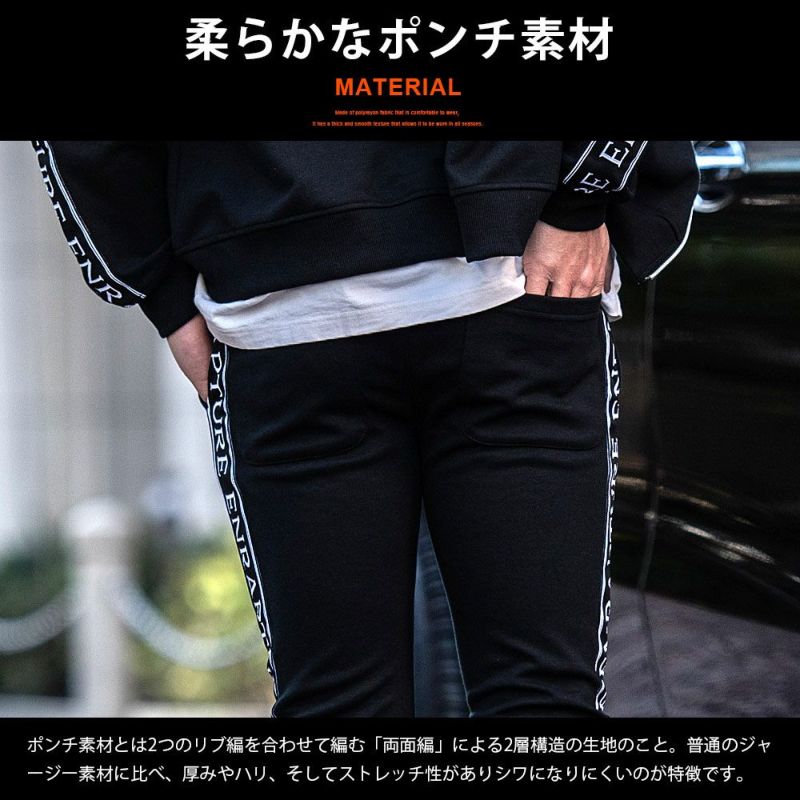 柔らかなポンチ素材を使用したサイドロゴパンツ。