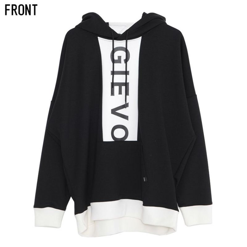 バックからフードにかけてと、フロント部分に大きなロゴプリントを施したインパクト抜群の長袖パーカー。
