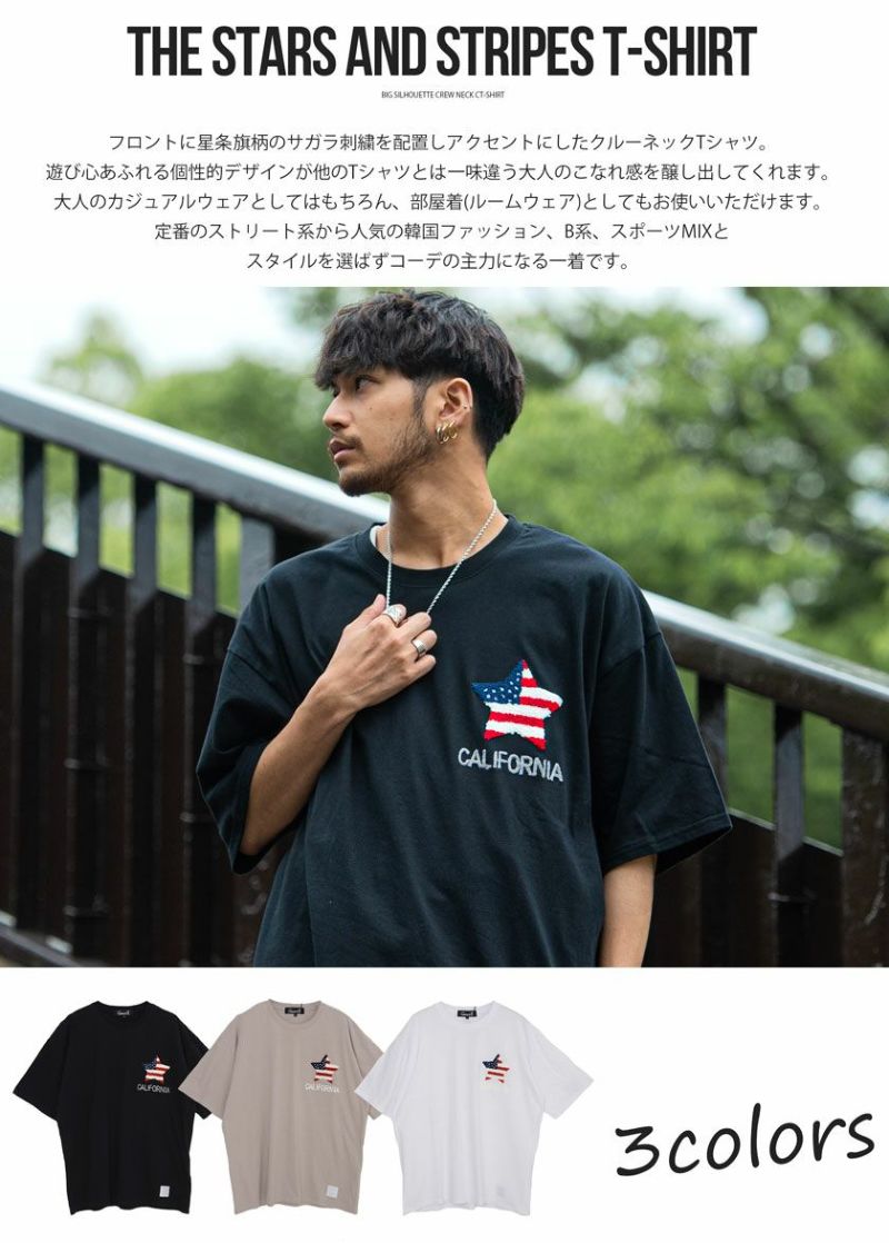暑い日でも涼しくおしゃれに!シンプルで着心地抜群の半袖Tシャツ。 【SALE/セール】CavariA(キャバリア)星条旗サガラ刺繍クルーネック半袖ビッグTシャツ/全3色