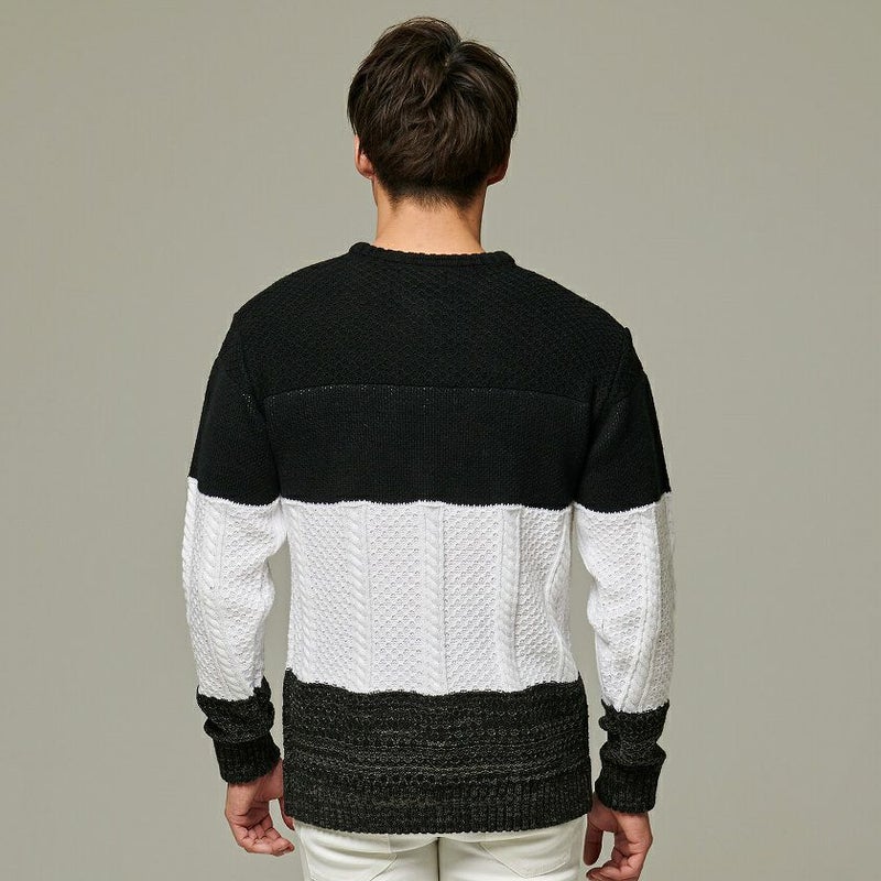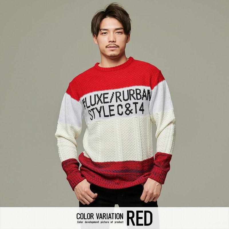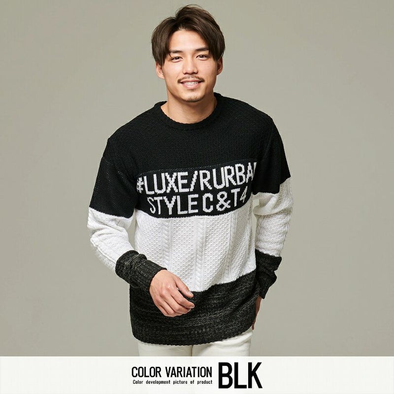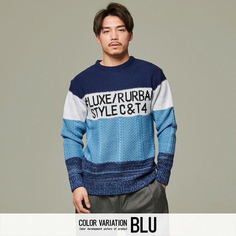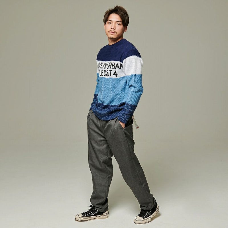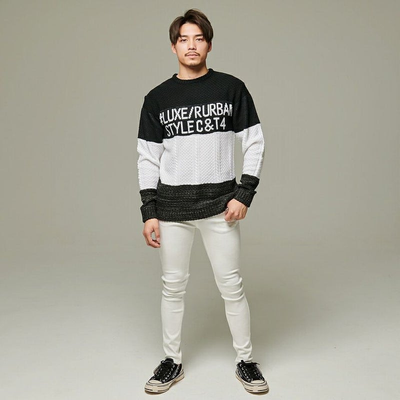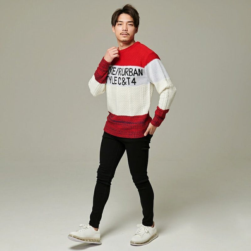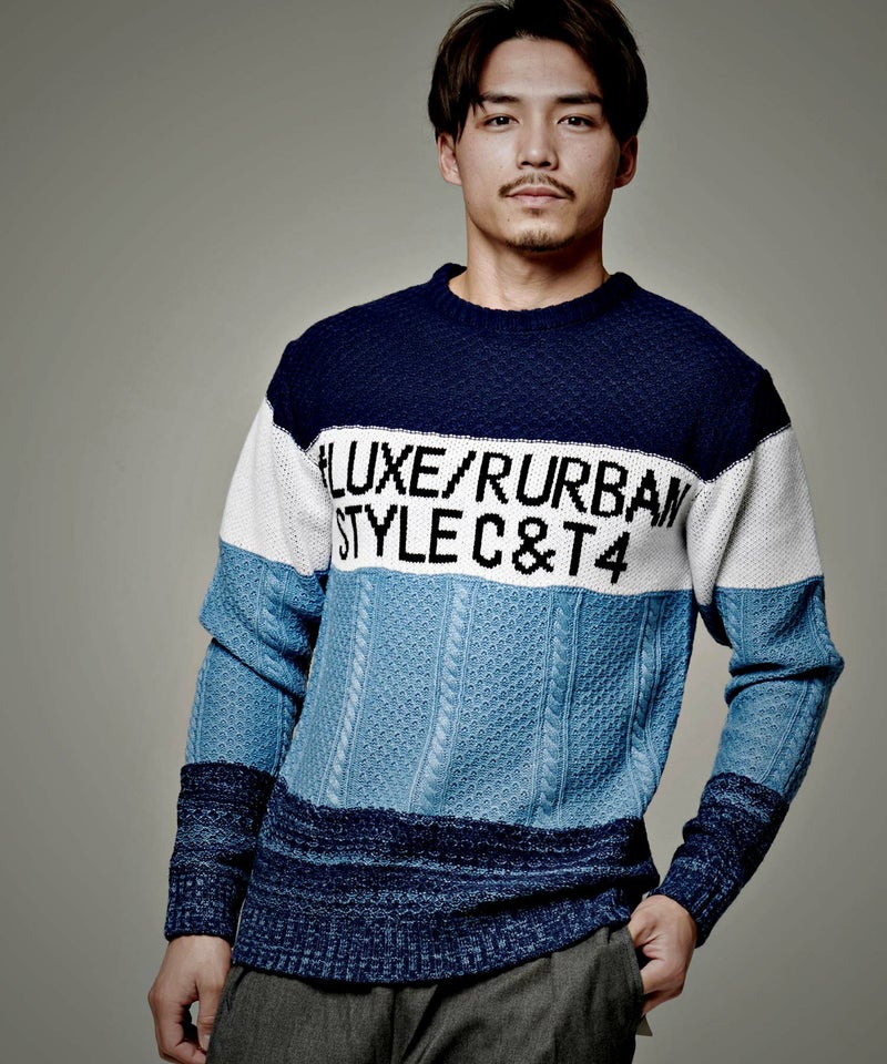 配色を切り替えたボーダー柄とフロントのロゴがアクセントになったジャガードボーダーニット。