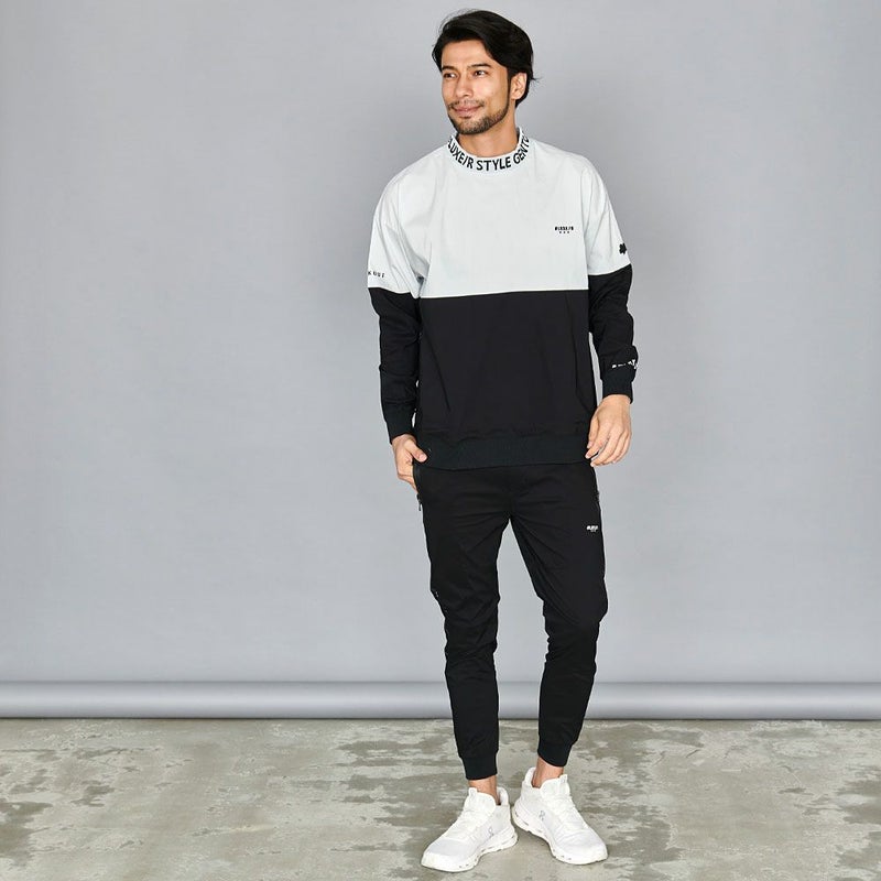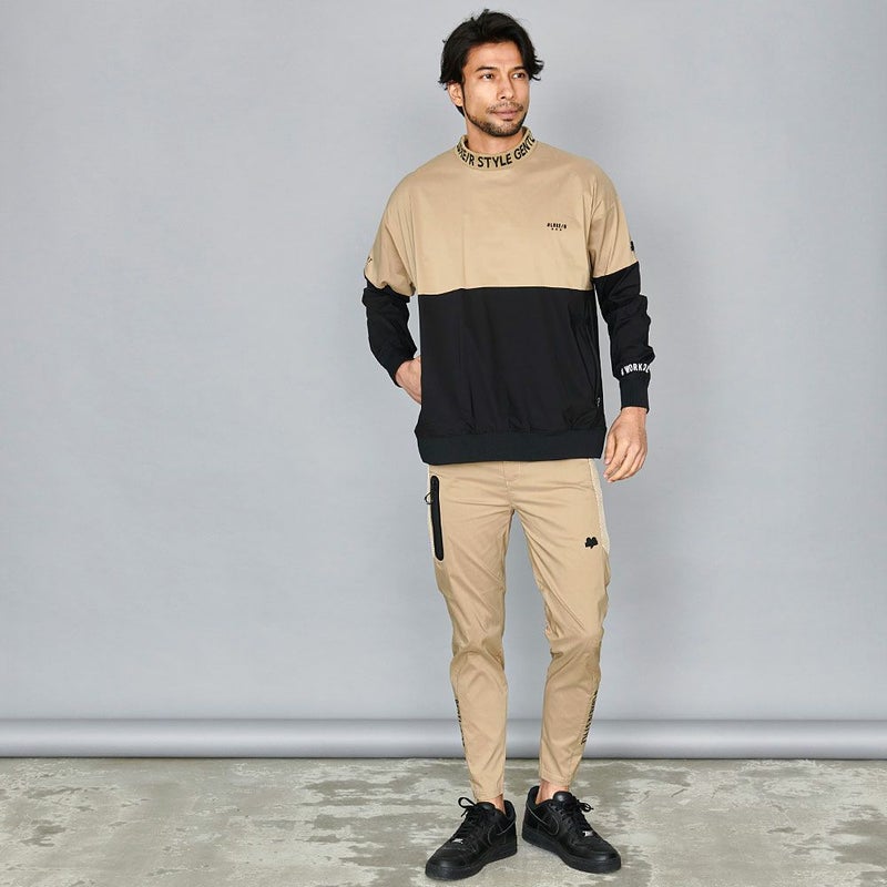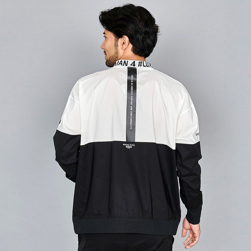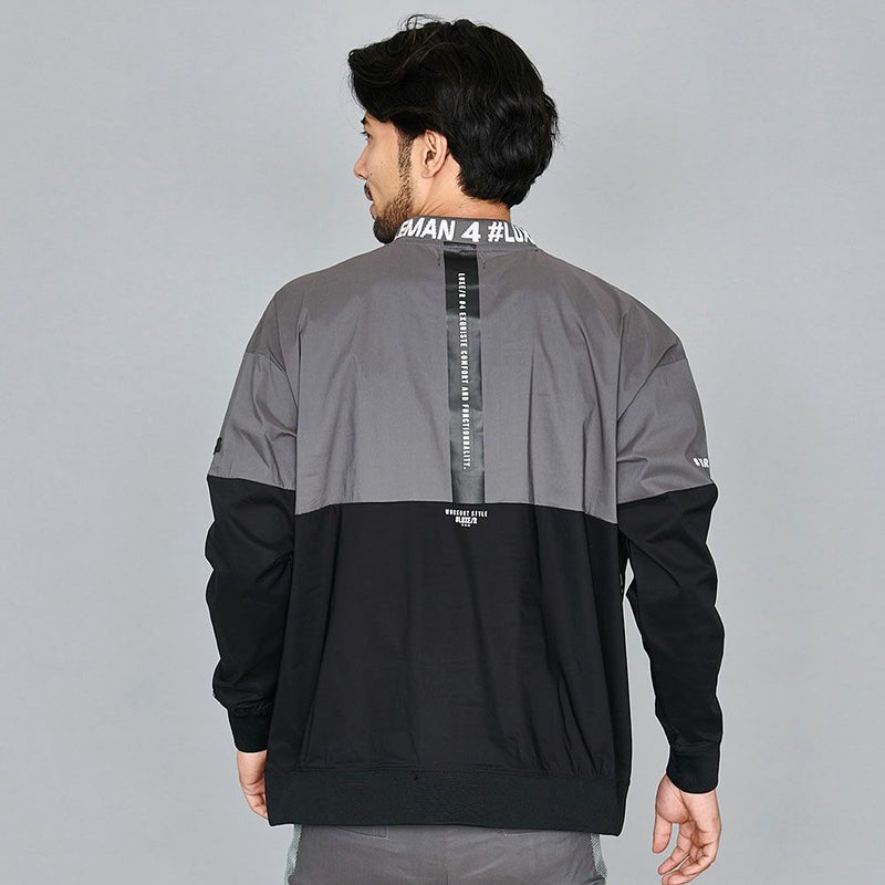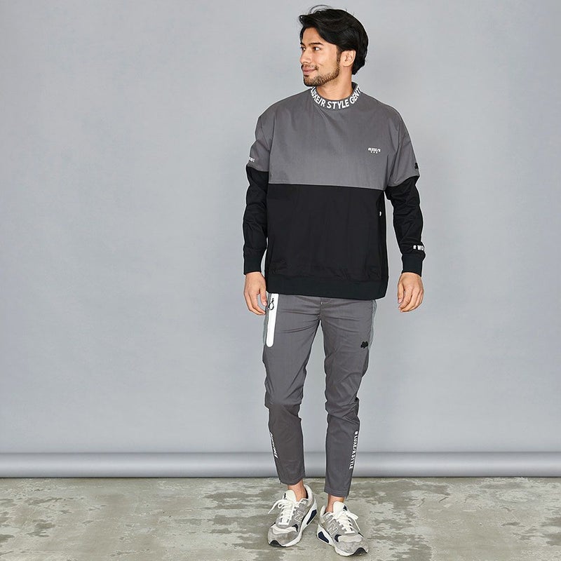 大胆な切り替え配色に、首元はジャガードロゴ入りのリブモックネックが目を引くデザイン。