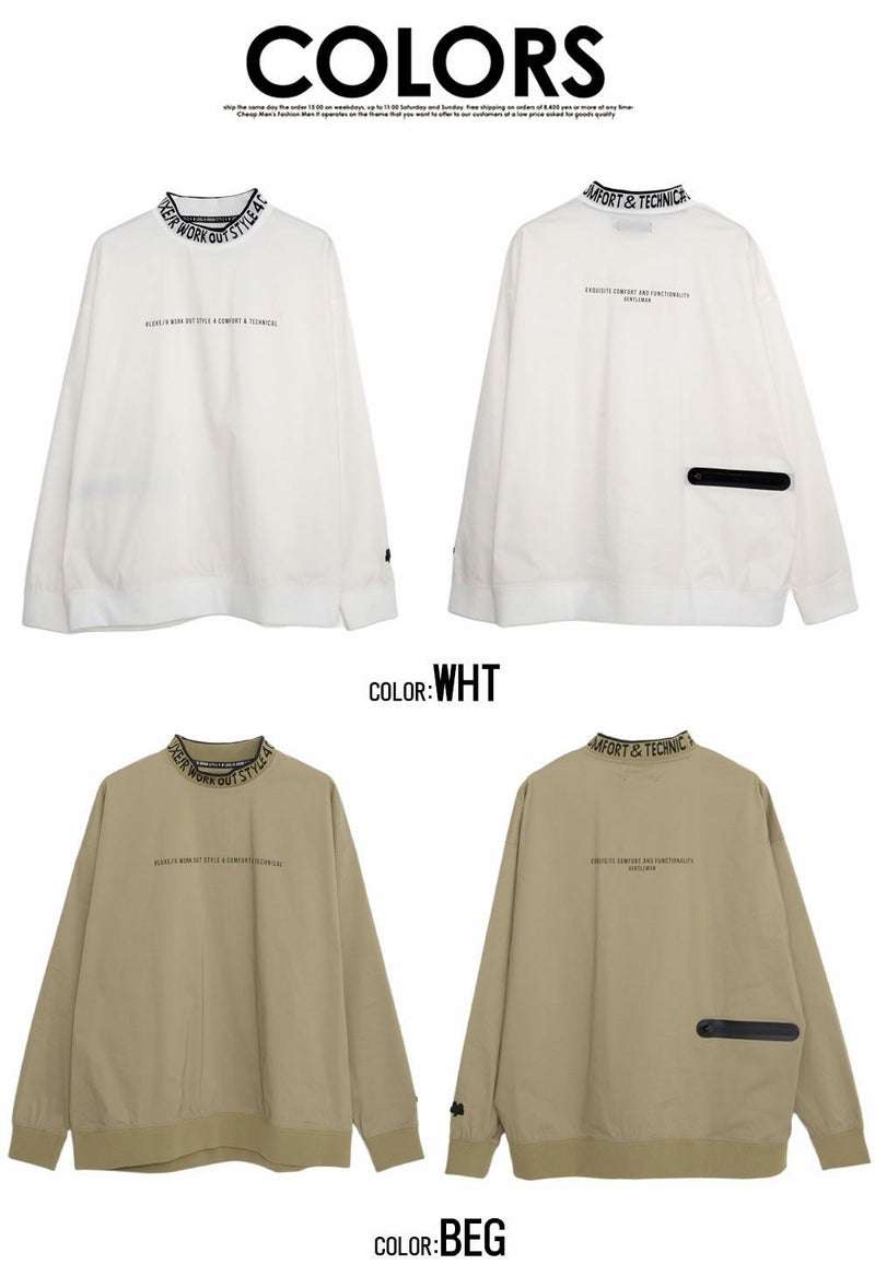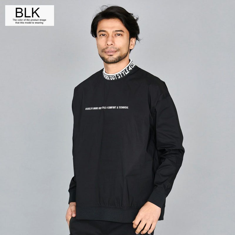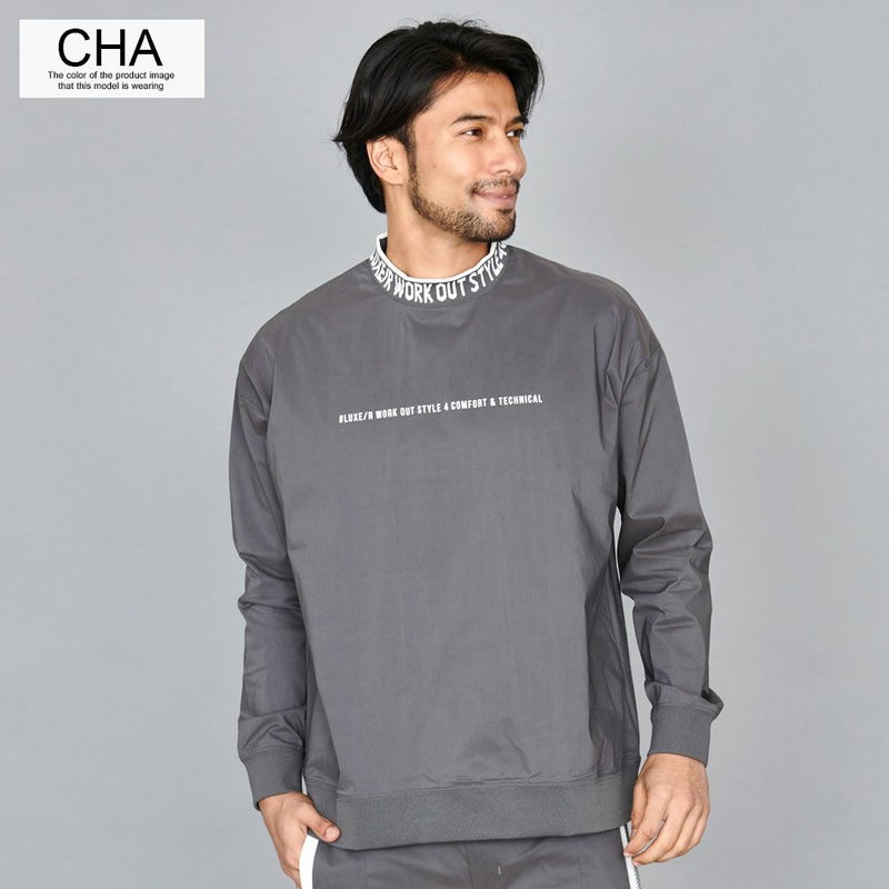 首周りにデザインしたロゴが目を惹くモックネックトレーナー。