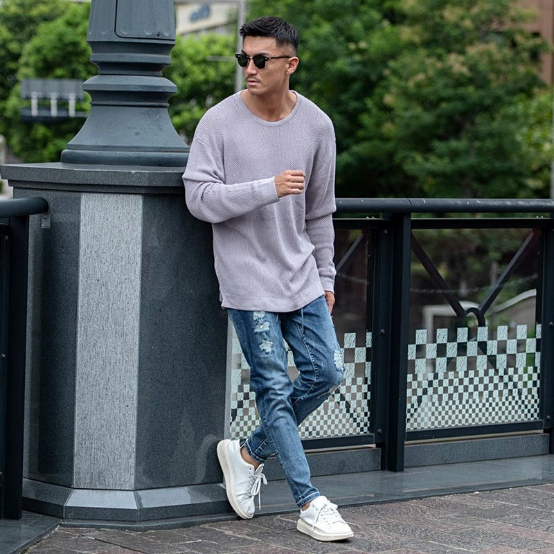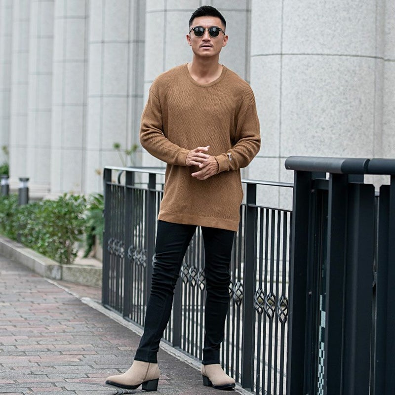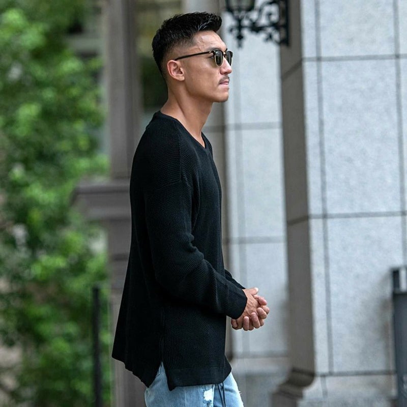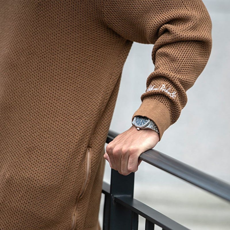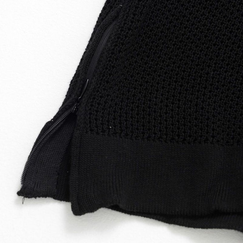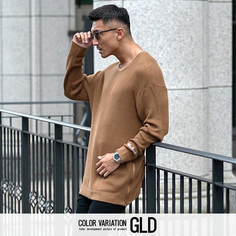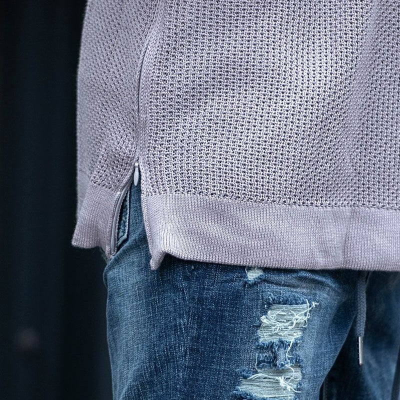 サイドにジップアップのついたクルーネックニット。