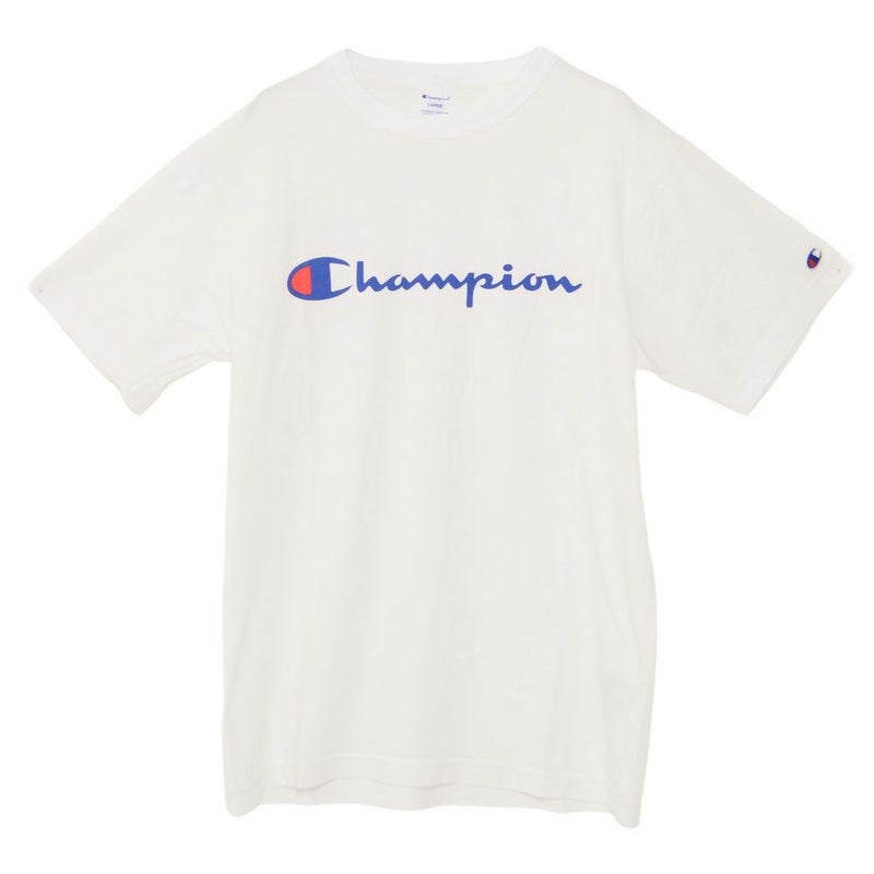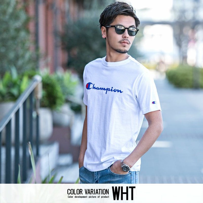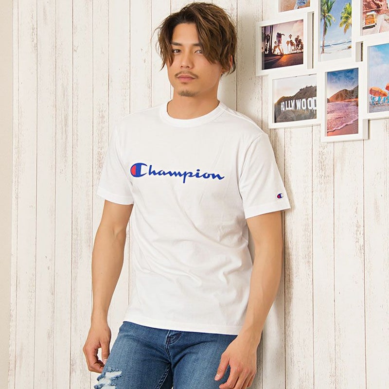 Championのロゴをフロントにプリントし、左袖にはChampionの象徴であるCロゴワッペンを配置したベーシックなデザインのTシャツ。
