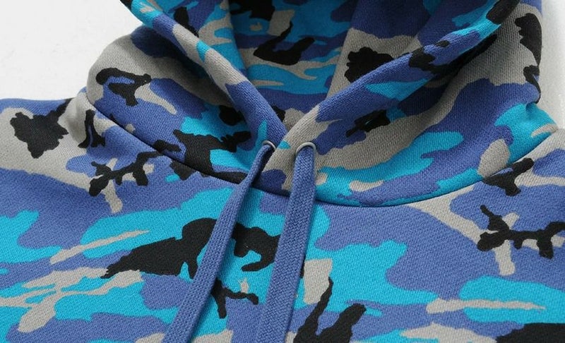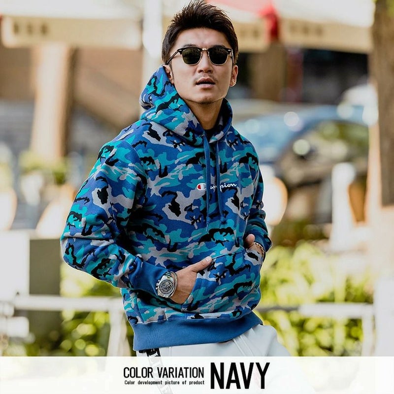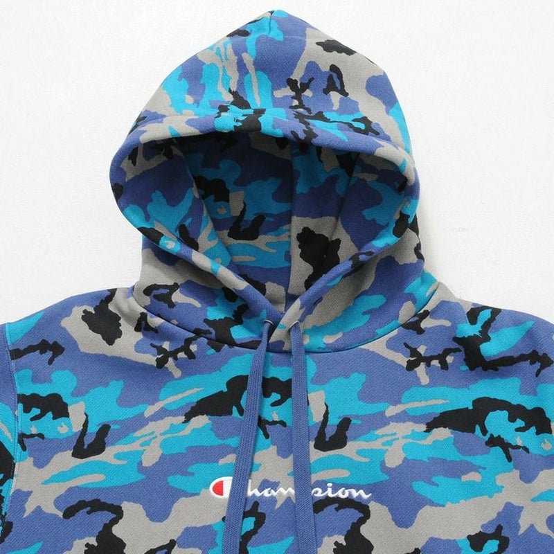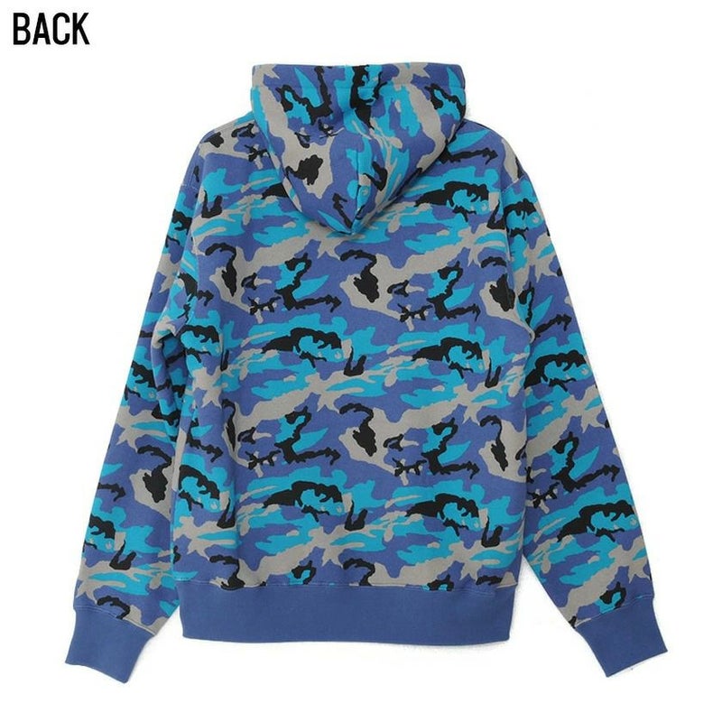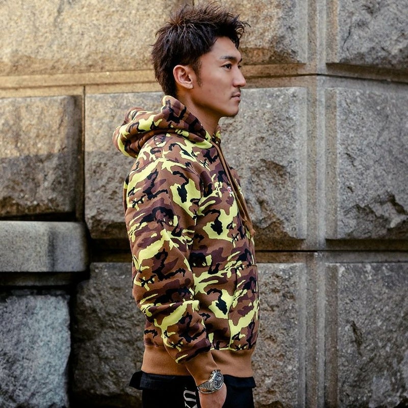 目を惹く迷彩柄のボディにセンターのロゴ刺繍とカンガルーポケットなど細部にまで拘ったアイテムです。