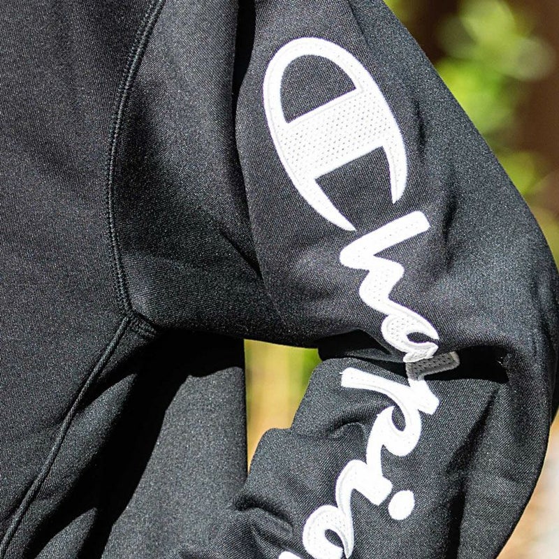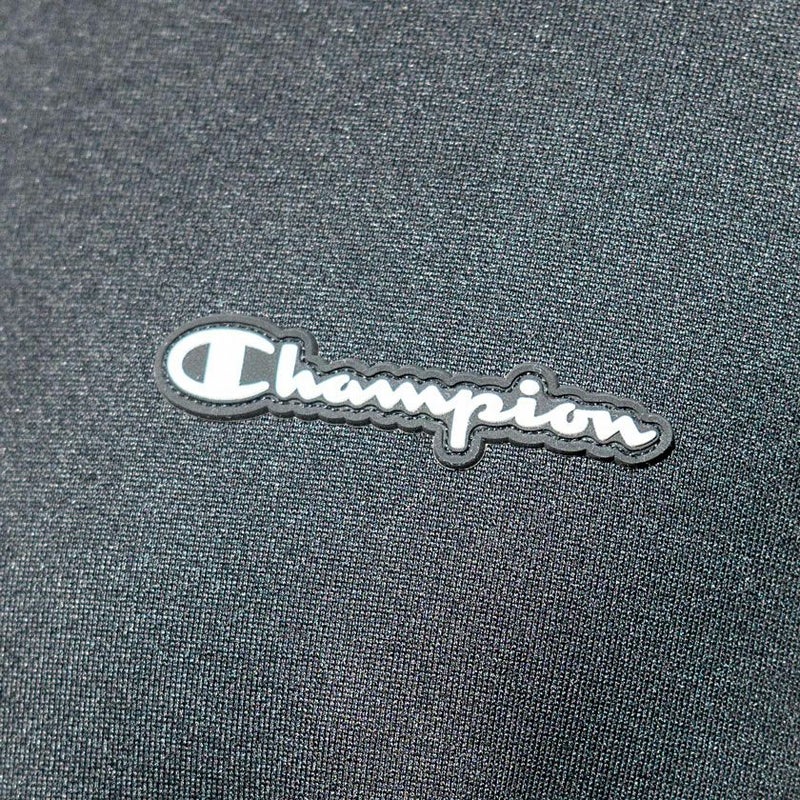 左胸にはChampion(チャンピオン)ロゴのシリコンワッペン、袖にはメッシュ素材のChampionロゴのアップリケを付けています。