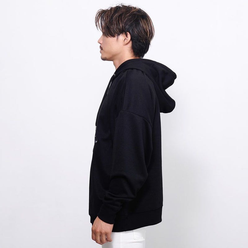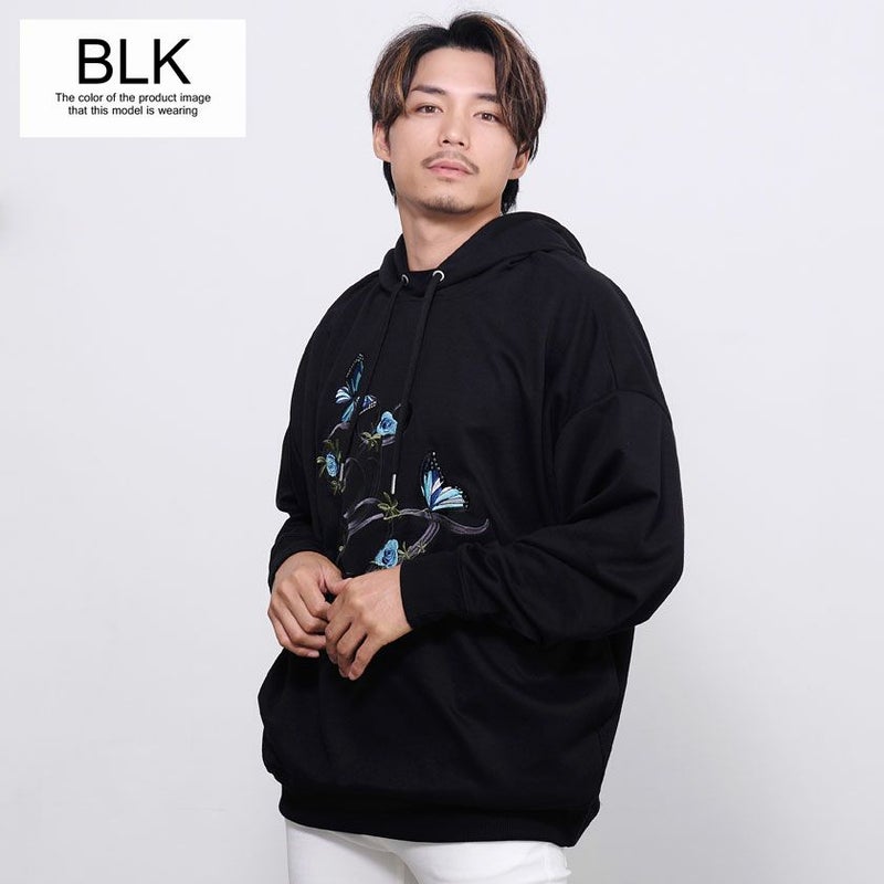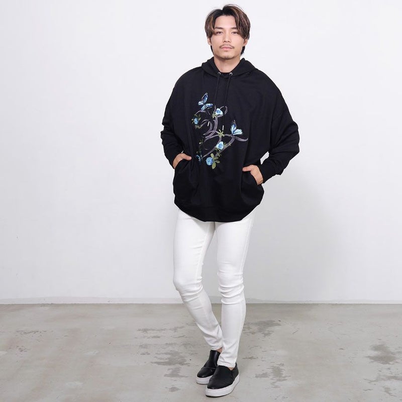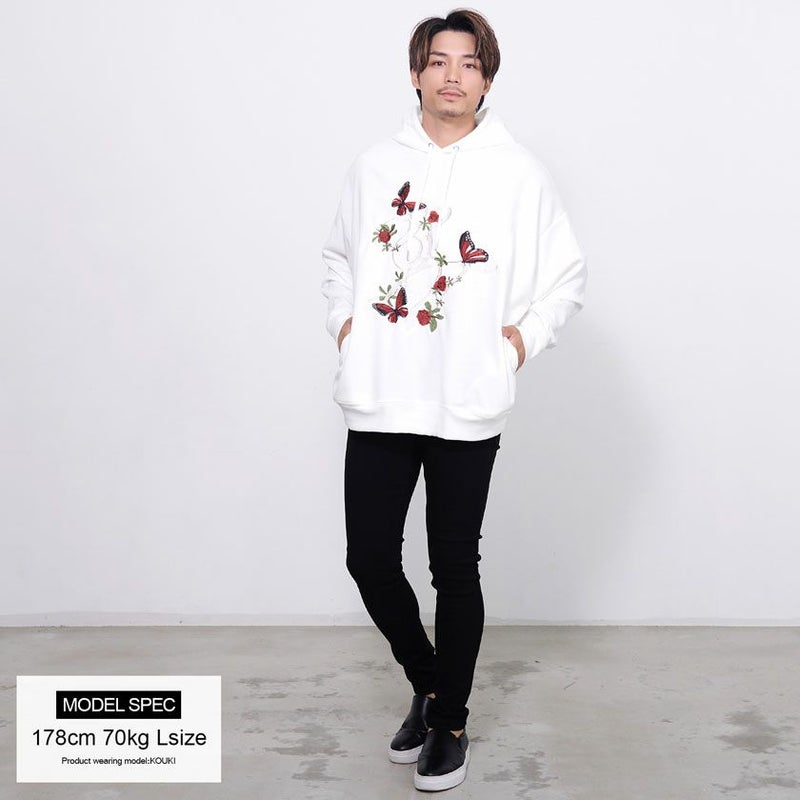 フロントにバタフライとローズの刺繍を施した雰囲気あるプルオーバーパーカー。