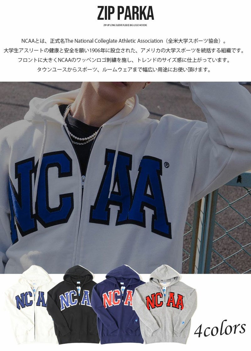 フロントに大きくNCAAのワッペンロゴ刺繍を施したジップパーカー。