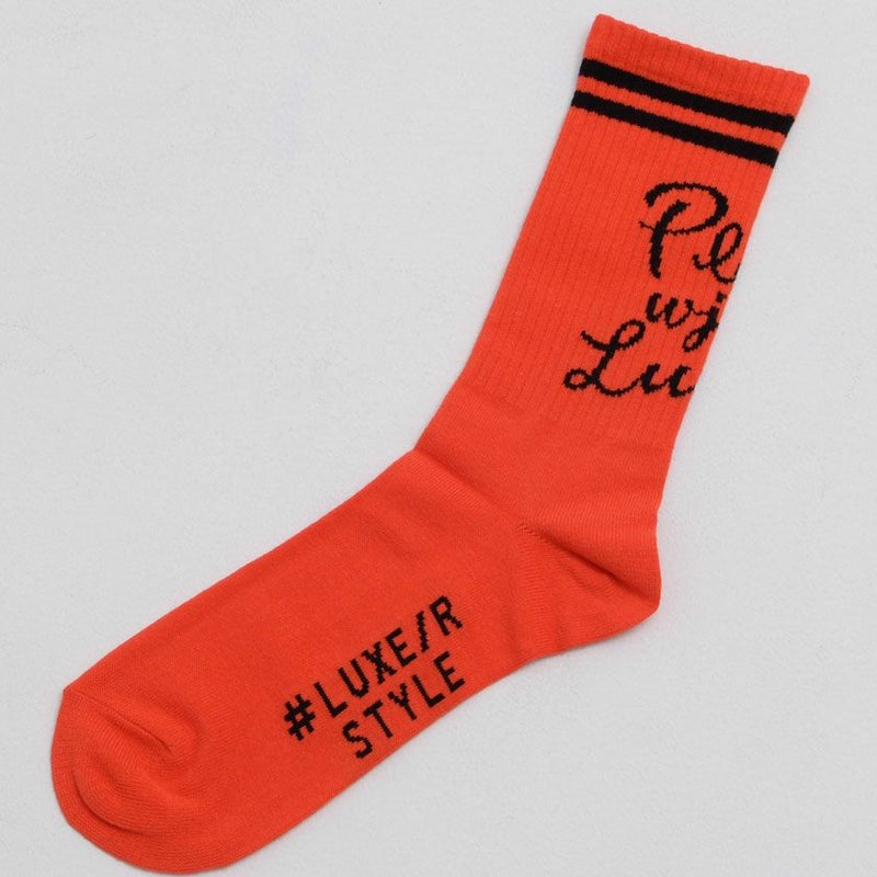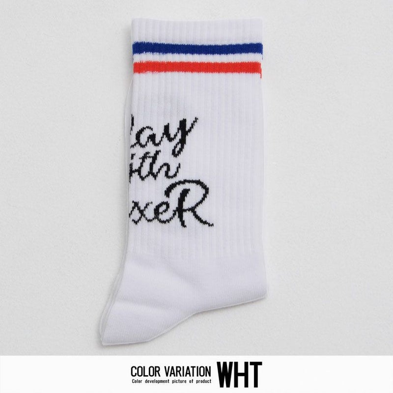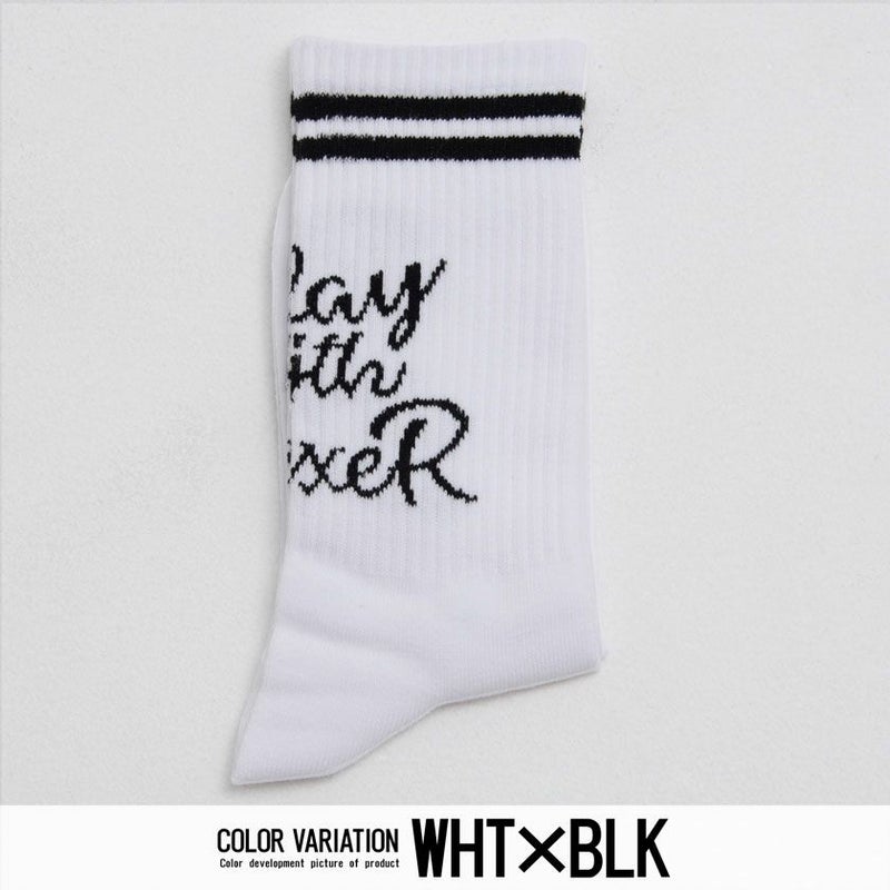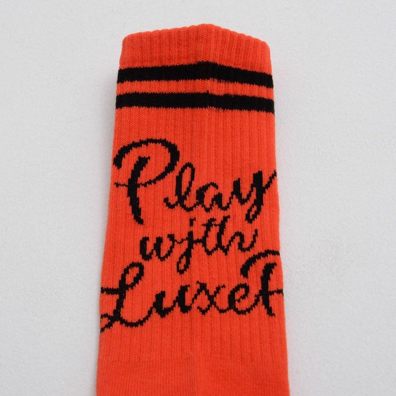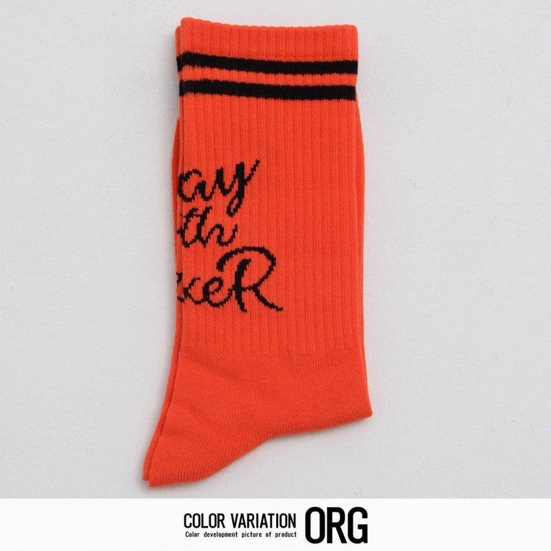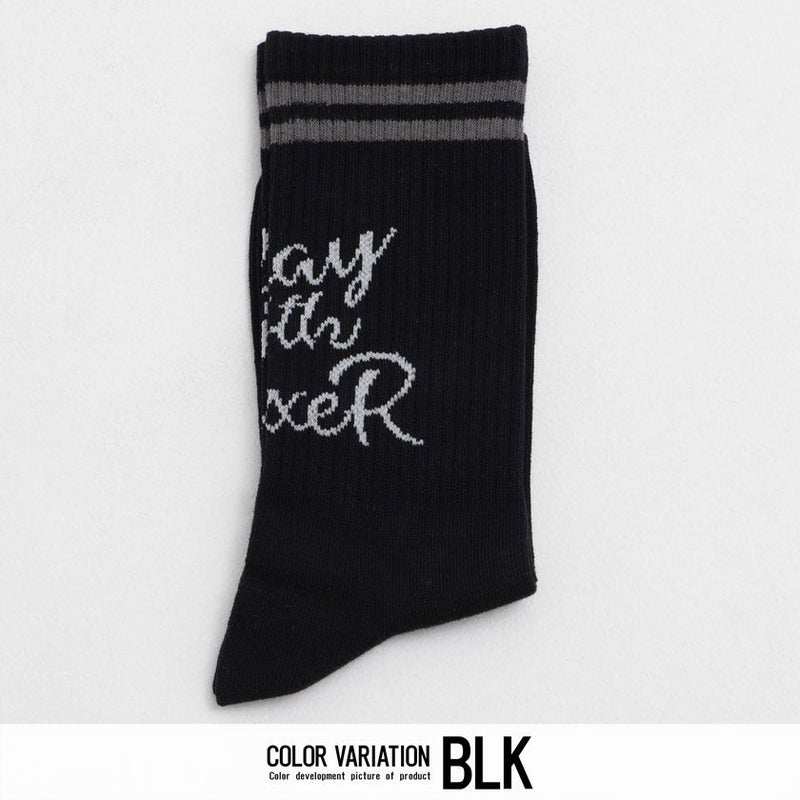 二本のラインと、フロント部分にプリントされた英字が印象的な、LUXE/Rオリジナルの日本製ソックスです