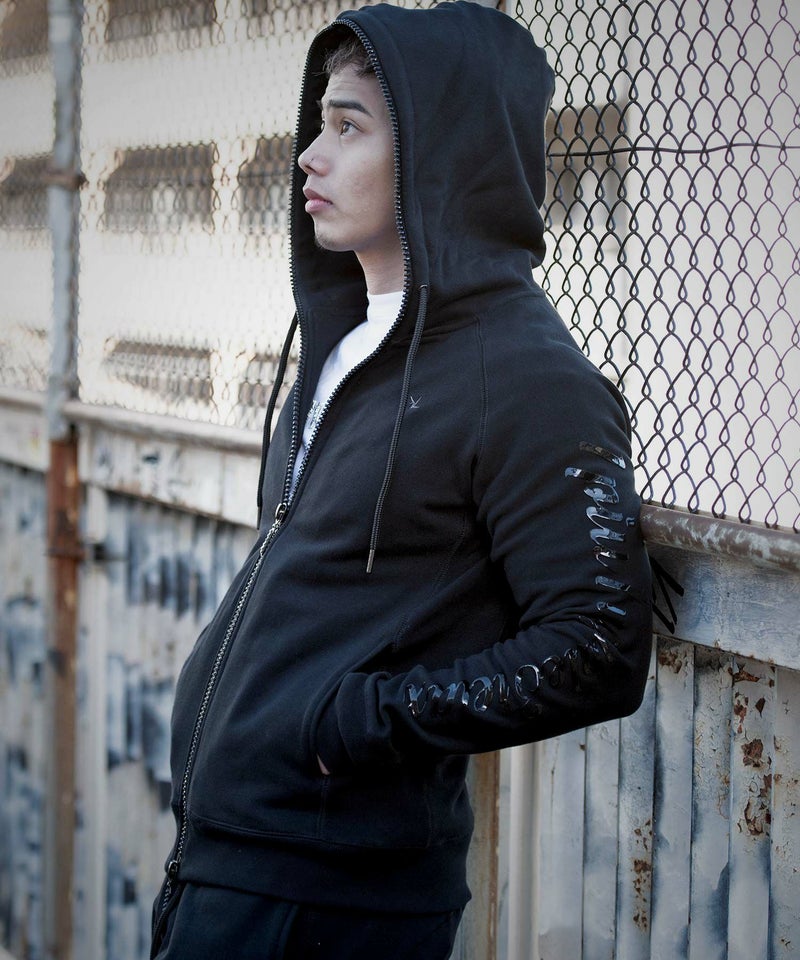 フロントからフードまでぐるりと囲んだファスナーにラインストーンを配置し、揺れる度にラグジュアリーな輝きが目を惹きます。