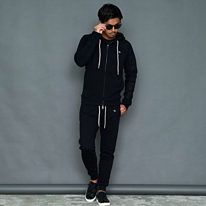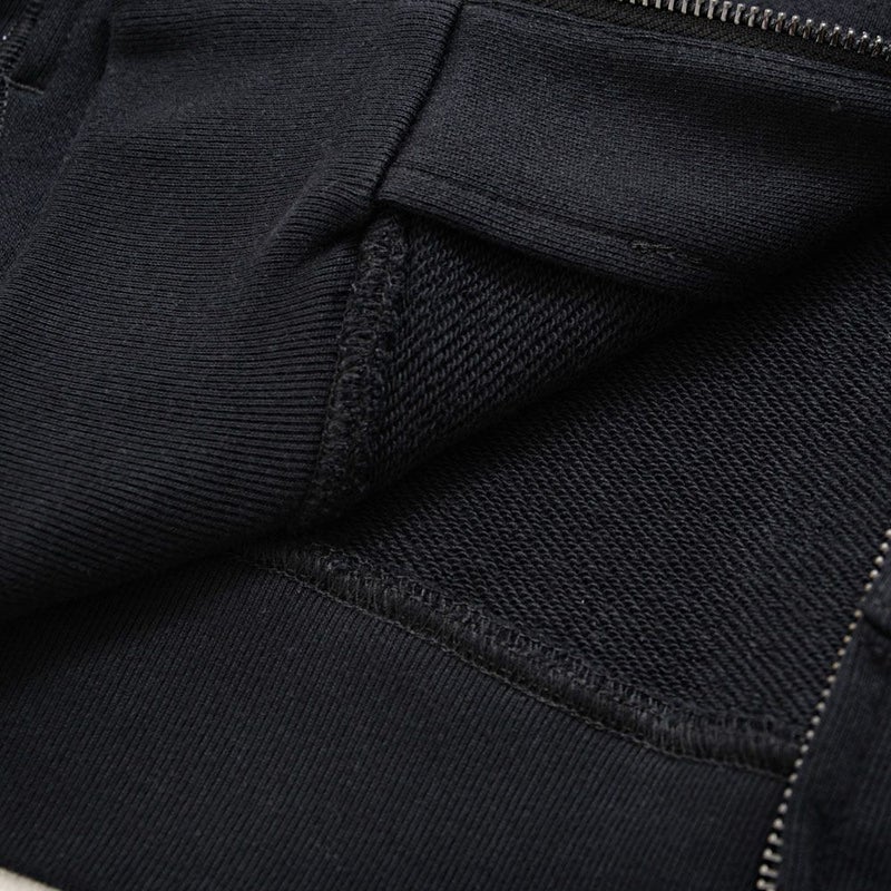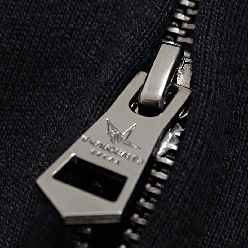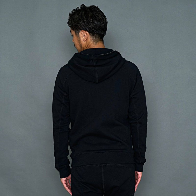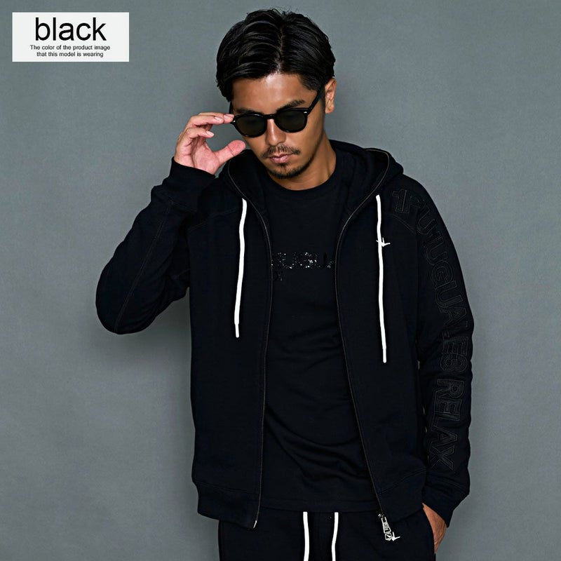 肩から袖口まで大胆にブランドロゴを配置したジップフーディー。