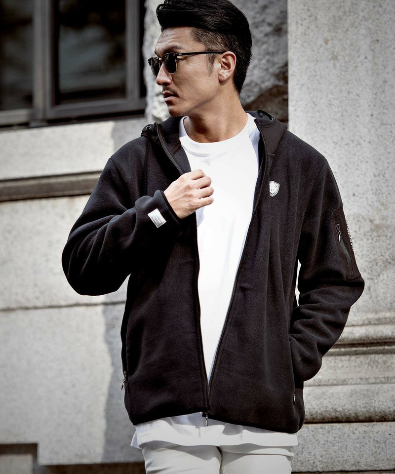 左胸にはブランドのオリジナルプレート(エンブレム)を配置してプレミアム感をプラス。