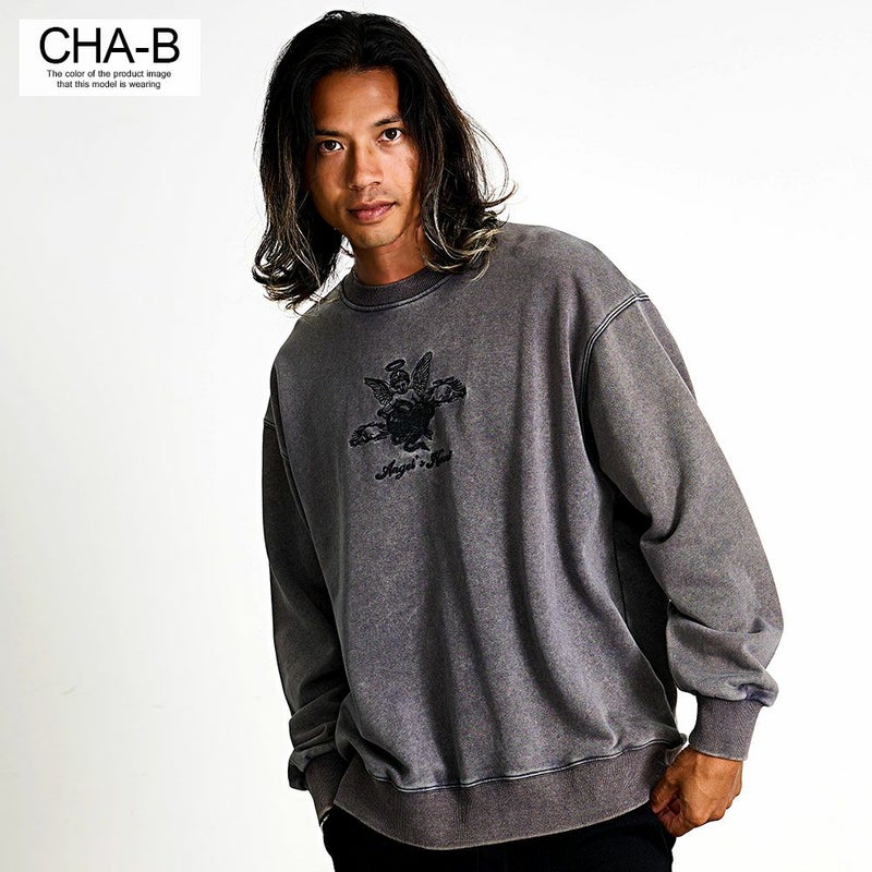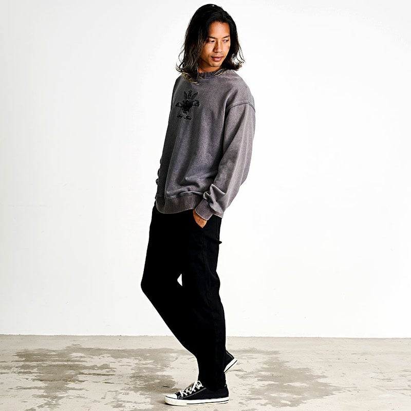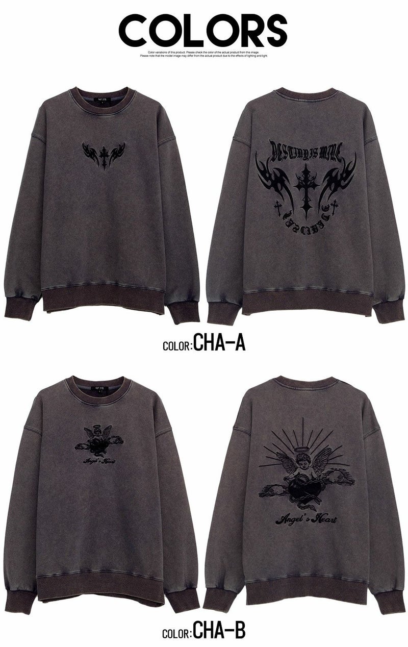 ヴィンテージ感漂うケミカルウォッシュ加工が魅力のクルーネックトレーナー。