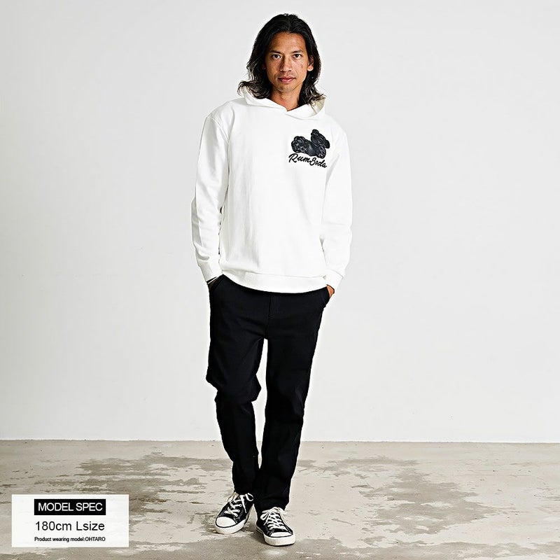 左胸とバックに施された立体的なアップリケ刺繍が存在感を放ち、シンプルなシルエットながら一枚でコーディネートの主役となるプルオーバーパーカーです。