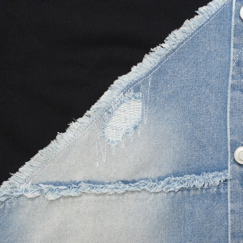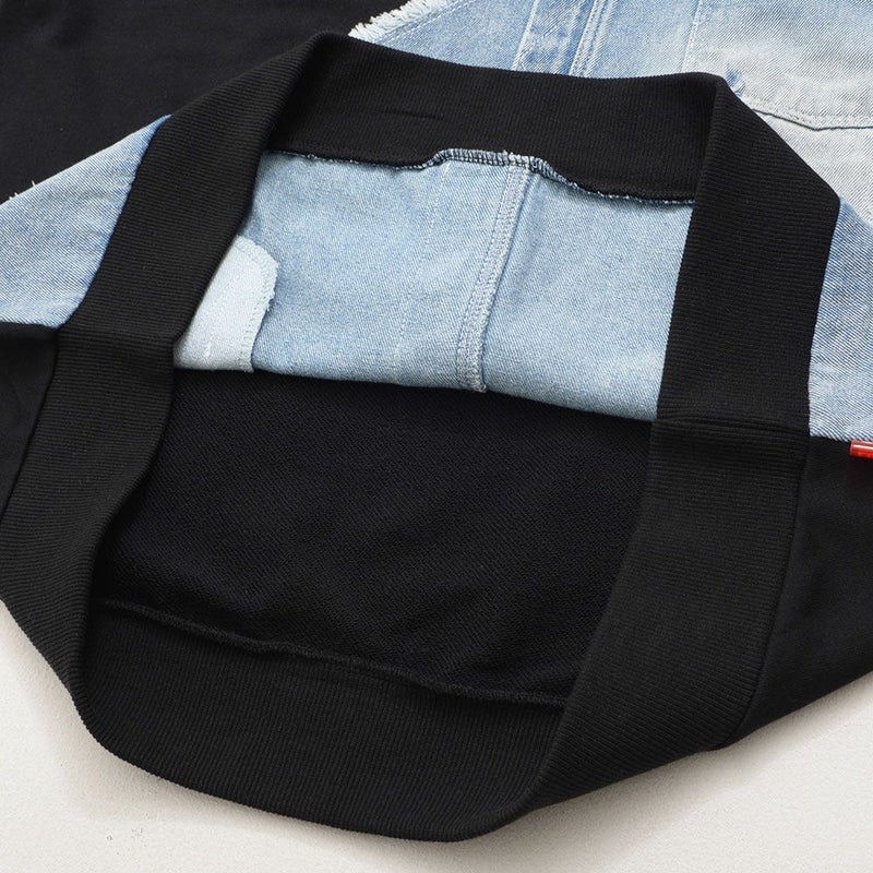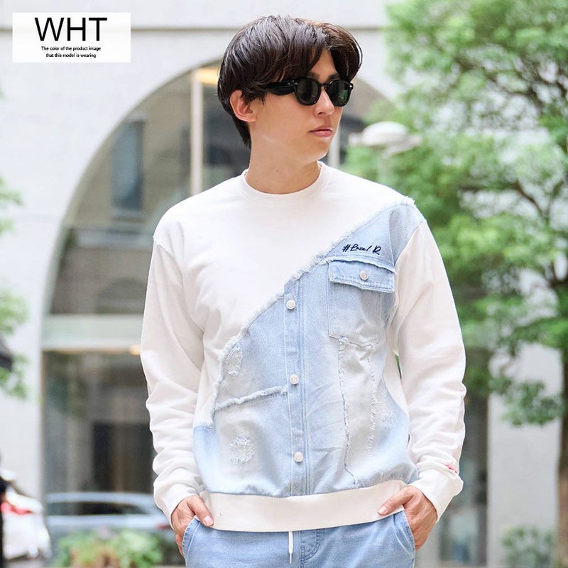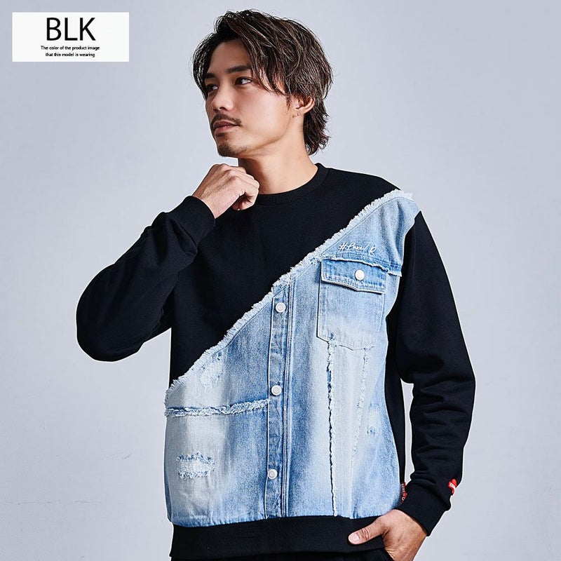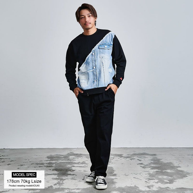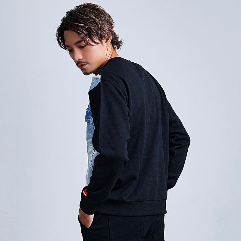 フロントに大胆に施されたデニム生地の切り替えデザインが目をひくスウェットトレーナー。