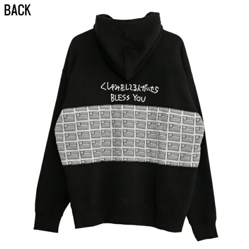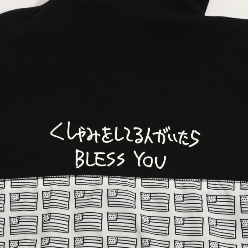 バック部分には「くしゃみをしている人がいたらBRESS YOU」と、アメリカに因んだ国旗のプリントを異素材で貼り付け、インパクト抜群なデザイン!