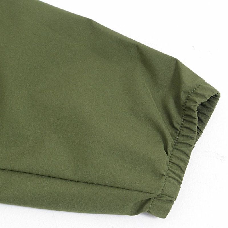 両サイドのジップポケット、フード口周りや袖口はゴム入りシャーリング仕様で裾にドローコードを施すなど高い機能性もポイント。