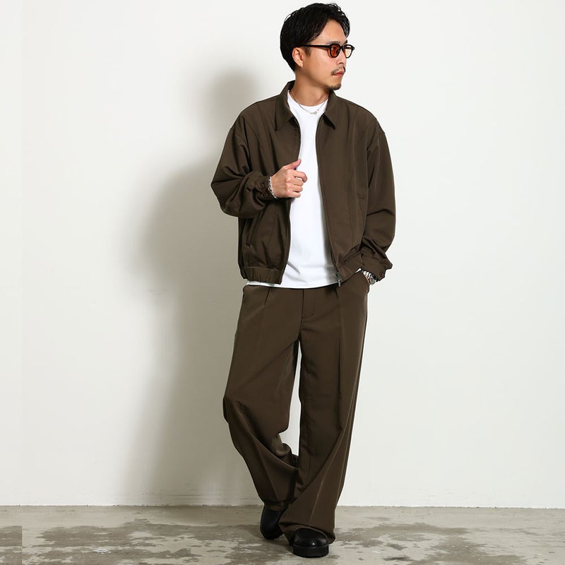同素材のワイドパンツと合わせれば、統一感あるモードなセットアップスタイルが完成。