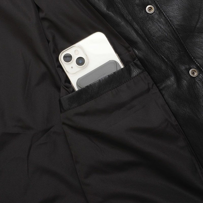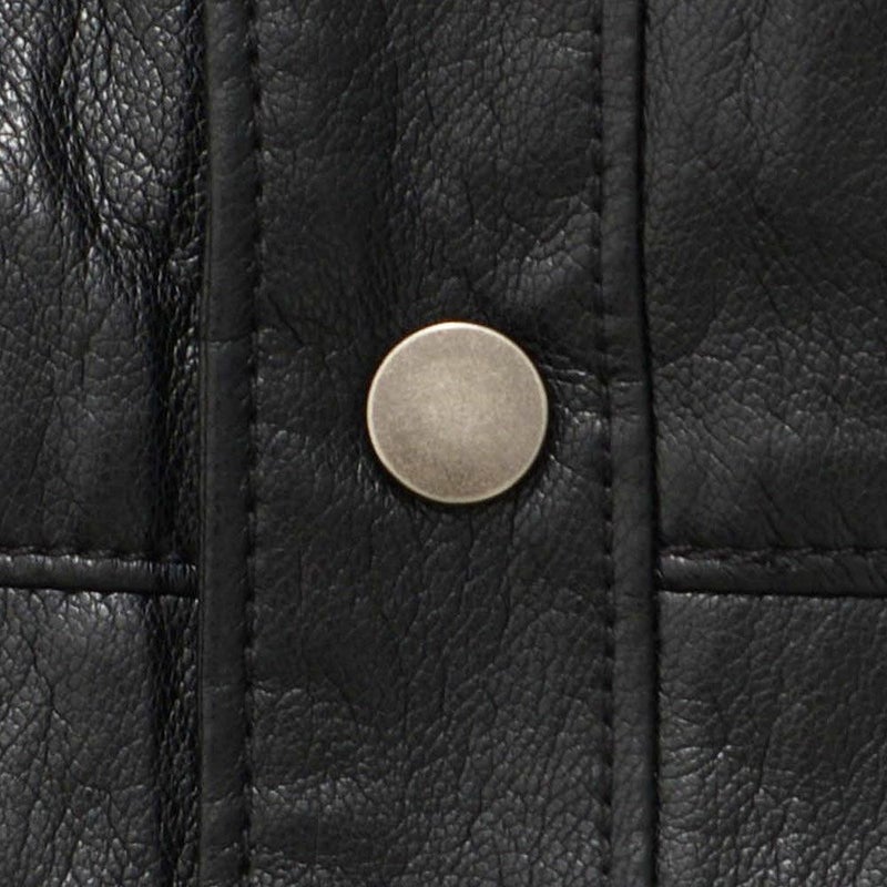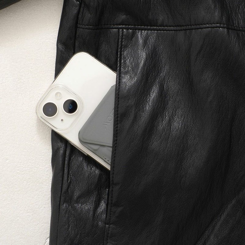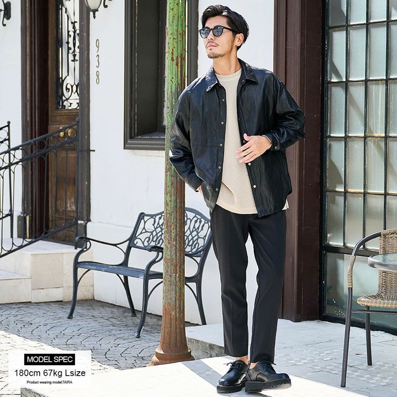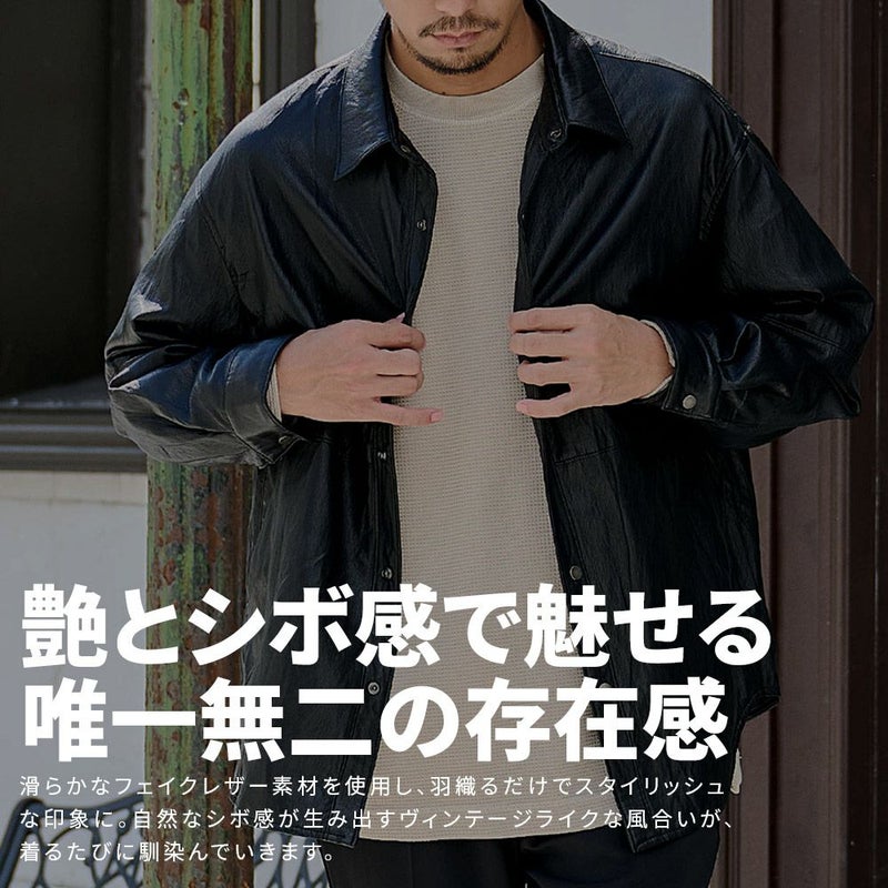 滑らかなフェイクレザー素材を使用し、羽織るだけでスタイリッシュな印象に。