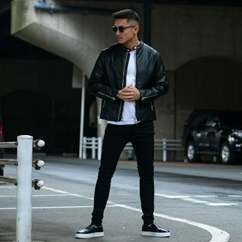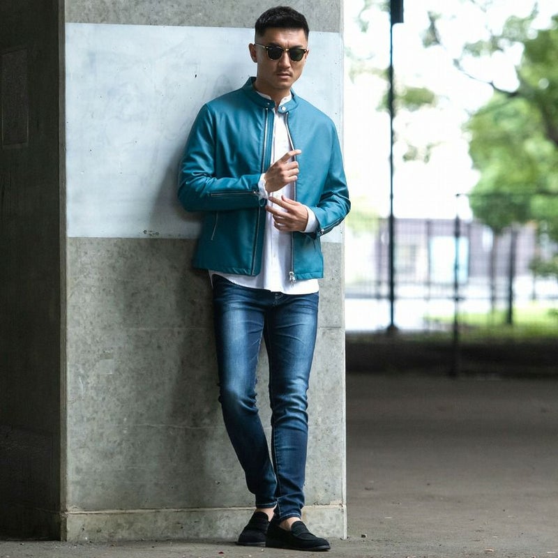 首元はシングルライダース定番のバンドカラーを採用し男らしい仕上がりに。
