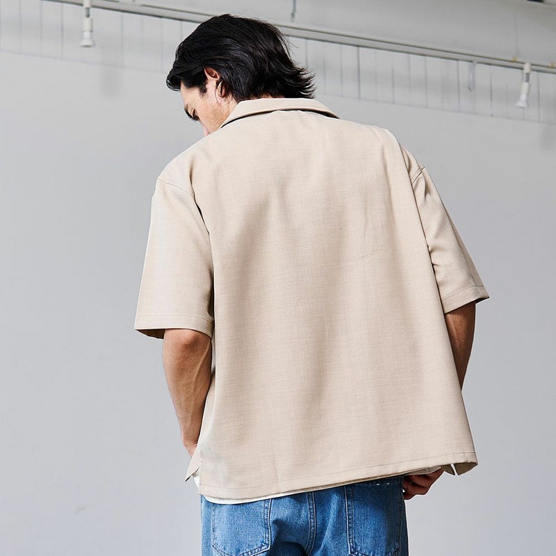 シンプルながら洗練された印象を与える、オープンカラーの半袖シャツ。