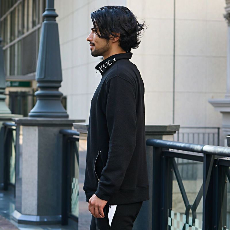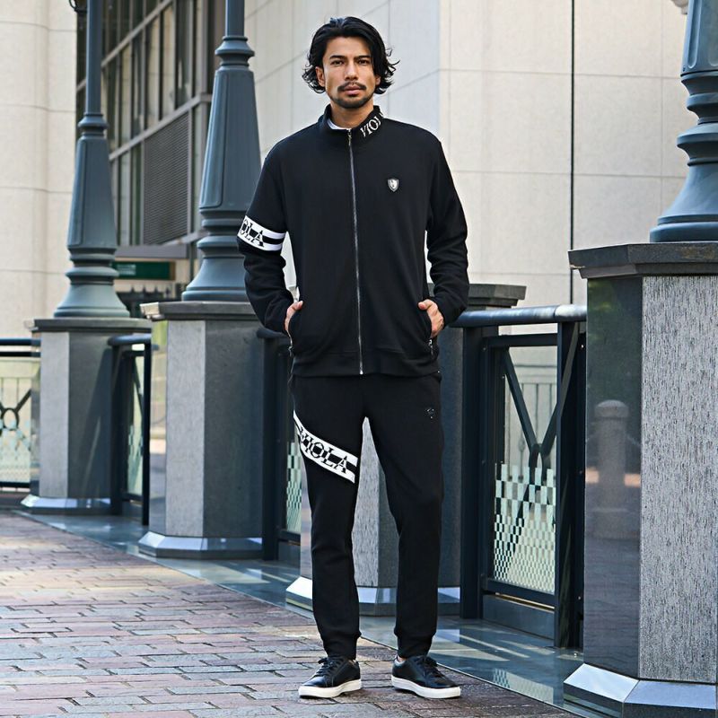 右腕と襟にロゴをほどこしコーデのアクセントにしたフルジップ長袖ジャケット。