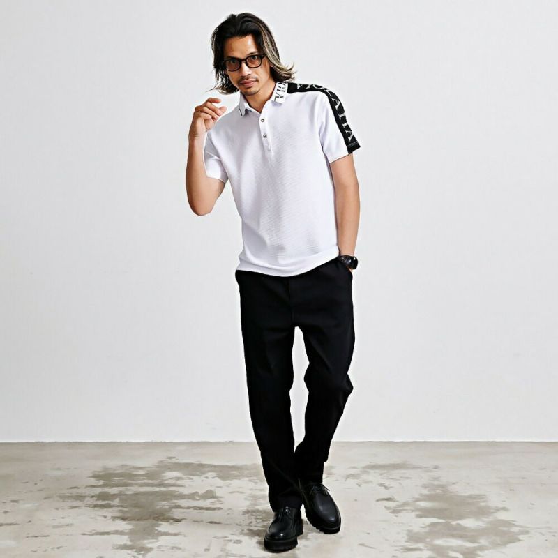 肩から左袖にかけて切り替えロゴをあしらったインパクト抜群の半袖ポロシャツ。