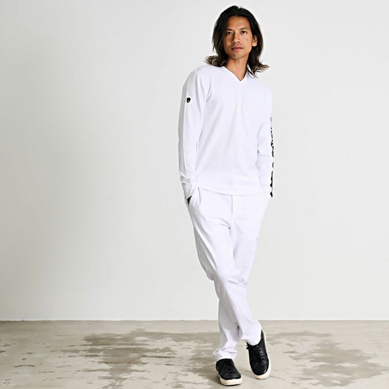 シンプルなVネックカットソーながらも、モード感とスポーティーさを兼ね備え、大人のラグジュアリースタイルを演出します。