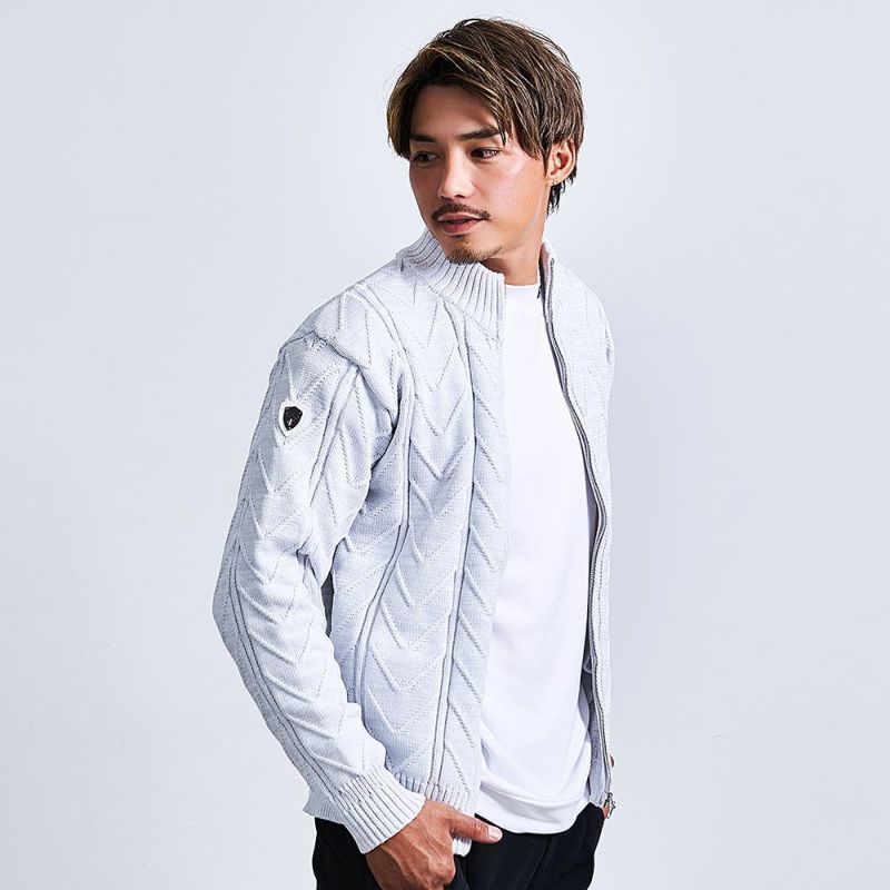 立体感のあるケーブル編みを全面にあしらい、コーディネートにアクセントを添えるニットブルゾン。